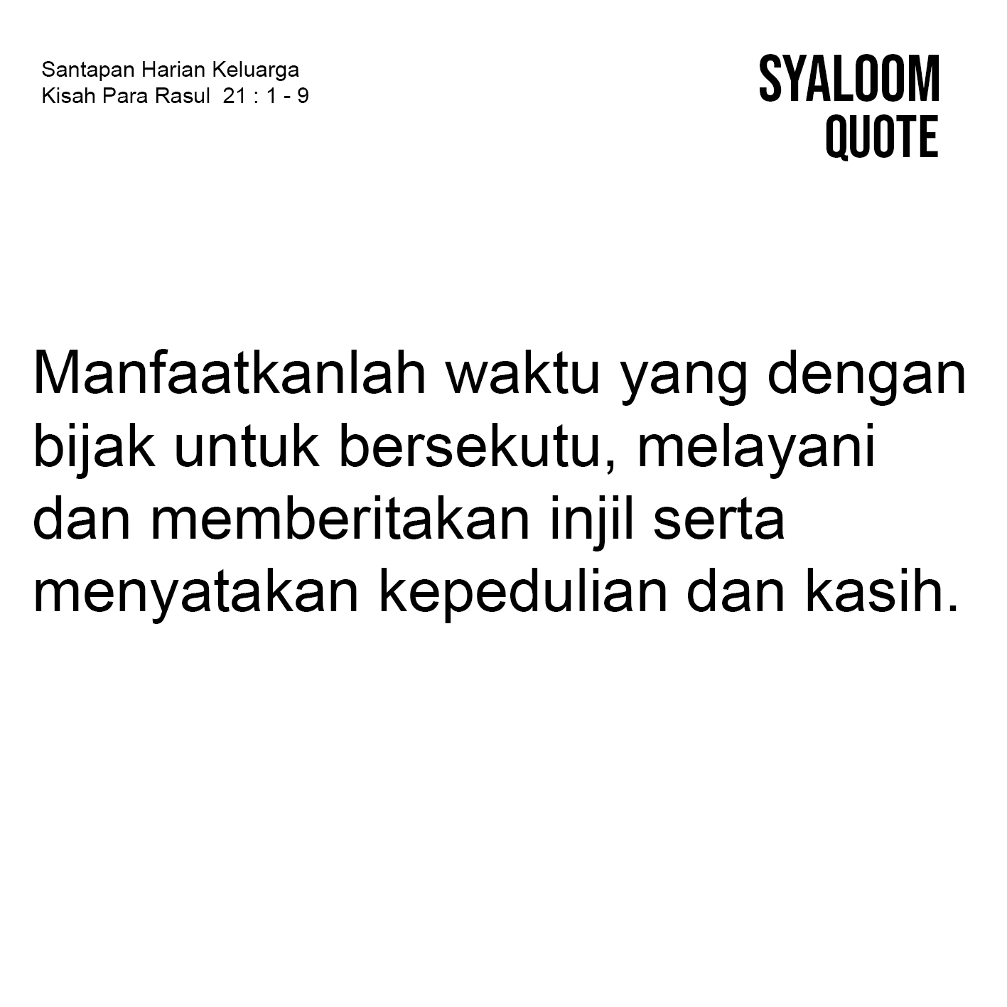 Rasul Paulus pun menyadari betapa waktu itu begitu penting. Maka setelah perpisahan yang berat dengan para penatua di Efesus, Paulus dan rekan-rekannya segera melanjutkan perjalanan mereka. Ayat 1–7 memperlihatkan bahwa bagaimana mereka terus bergerak tanpa henti. Mereka menggunakan setiap kesempatan yang ada di setiap tempat yang disinggahi kapal yang mereka tumpangi untuk mengunjungi, melayani dan bersekutu dengan saudara-saudara seiman. Paulus dan rekan-rekannya tidak menyia-nyiakan waktu sebagai kesempatan berharga untuk menyatakan kasih dan kepedulian mereka terhadap jemaat. Mereka mau mengetahui keadaan saudara-saudara seiman dan menyaksikan karya Tuhan melalui para hamba-Nya sebagaimana Filipus dan keempat anak gadisnya yang memiliki talenta khusus dalam melayani Tuhan. Mereka juga tidak lupa menyerahkan segala sesuatu kepada Tuhan. Karena mereka tahu, perjalanan mereka tidak akan berhasil tanpa campur tangan Tuhan. Hidup ini begitu singkat dan kesempatan tidak selalu ada. Maka manfaatkanlah waktu yang diberikan Tuhan dengan bijak sebagai satu kesempatan emas untuk bersekutu, melayani dan memberitakan injil serta menyatakan kepedulian dan kasih terhadap mereka yang menderita.