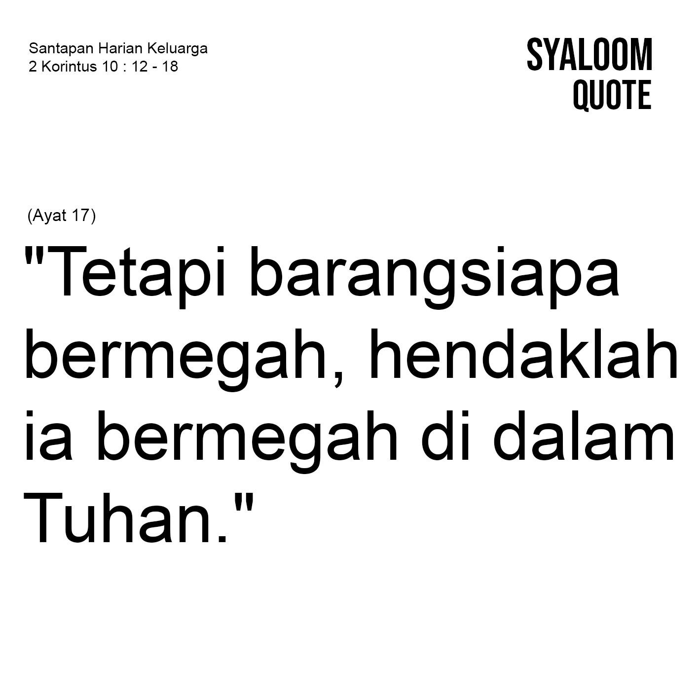 Perikop hari ini menceritakan tentang sekelompok orang di Korintus yang membanggakan diri atas pertumbuhan jemaat korintus. Mereka bermegah dengan menjadikan diri sendiri sebagai pusat untuk mengukur segala sesuatu. Paulus menyebut mereka bodoh! Mereka membanggkan sesuatu yang bukan hasil kerja mereka dan bermegah atas hasil kerja orang lain, yang mereka akui sebagai hasil pekerjaannya. Padahal itu adalah hasil kerja Paulus bersama dengan teman sekerjanya. Ini artinya bermegah dengan penuh kebohongan. Paulus kemudian menjelaskan bahwa kebanggaan yang benar adalah karena ada iman yang tumbuh akibat pemberitaan injil. Ini menyebabkan Paulus memiliki kesempatan lebih besar untuk melayani di tempat yang lebih luas lagi. Bermegah bukanlah suatu tindakan yang salah. Namun, Paulus menjelaskan kepada jemaat di Korintus bahwa jika mereka bermegah hendaklah mereka bermegah di dalam Tuhan. Maksudnya, kemegahan ini seharusnya tidak terlepas dari kesadaran bahwa keberhasilan yang dicapai adalah berkat campur tangan Tuhan. Kemegahan itu seharusnya terjadi juga merupakan kemegahan karena prestasi yang dihasilkan dari kerja keras, yang tetap menjunjung nilai-nilai kejujuran dan kebenaran. Jadi bukan keberhasilan oleh karena kebohongan dan manipulasi. Jadi bangga diri tidaklah salah. Tetapi hendaklah kita bermegah di dalam Tuhan, karena kebanggaan yang terlepas dari kesadaran akan campur tangan Tuhan akan berubah menjadi keangkuhan.
