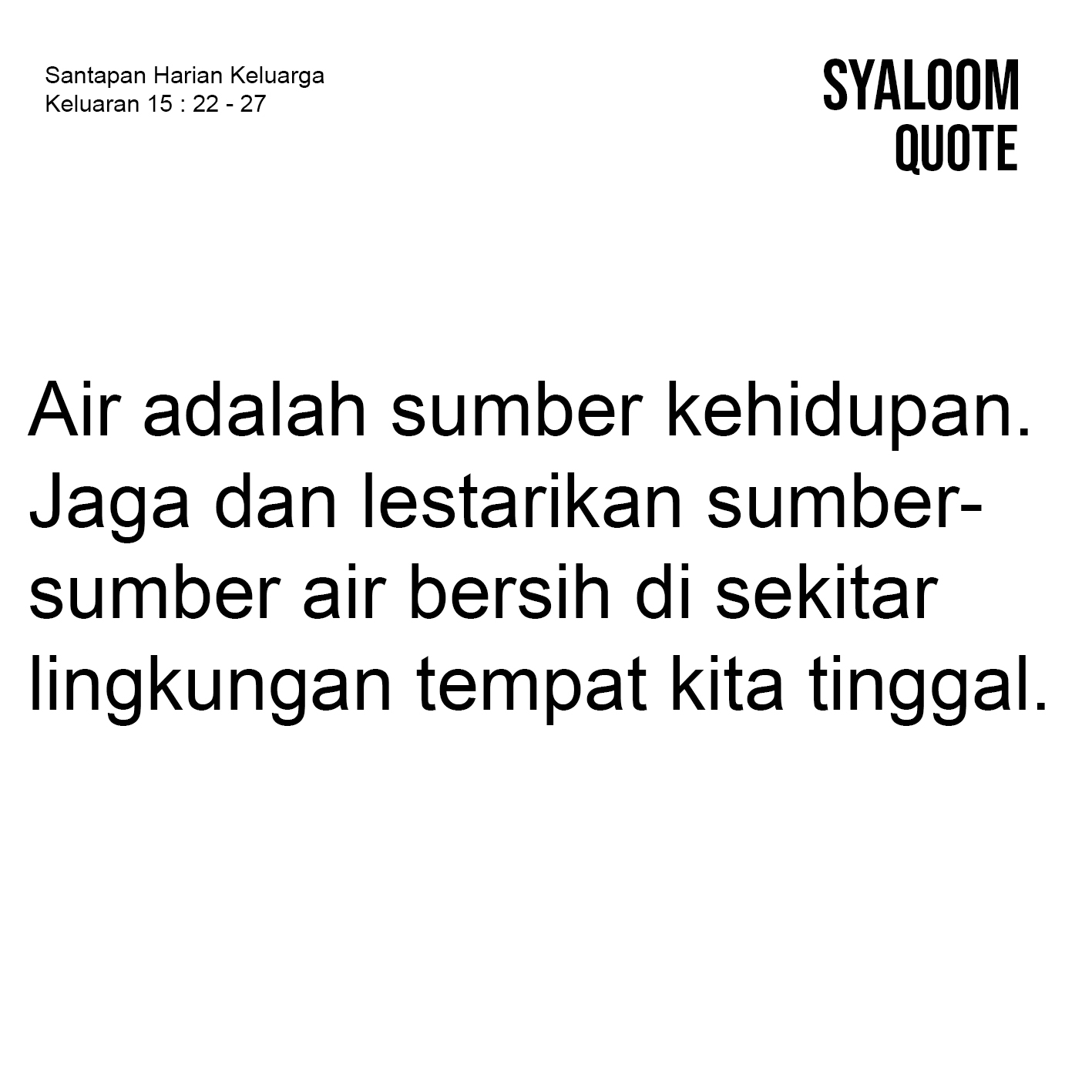 Kurang lebih 60% dari total berat tubuh manusia adalah air/cairan, karenanya tak heran cairan menjadi zat yang sangat penting untuk membantu tubuh kita agar tetap sehat sehingga dapat menunjang kehidupan dan aktivitas setiap hari. Air menjadi kebutuhan hidup yang sangat penting bagi manusia. Keluaran 15:22-27 mengisahkan tentang peristiwa setelah penyeberangan Laut Merah, bangsa Israel mulai bersungut-sungut karena kekurangan air minum yang layak untuk dikonsumsi. Mereka mengkritik dan menyalahkan Musa, karena tidak memberikan solusi yang memadai terhadap masalah kekurangan air. Meresponi semua persungutan dan keluhan mereka, Musa berbalik kepada Tuhan dan berdoa. Tidak ada cara lain yang dapat dilakukan Musa selain menyerahkan persoalan krisis air ini kepada Tuhan. Tuhan dengan kemurahan hati-Nya memberikan solusi atas kekurangan air tersebut. Musa diperintahkan untuk melemparkan kayu ke dalam air yang pahit, dan air itu menjadi manis sehingga dapat diminum oleh bangsa Israel. Di tengah kondisi padang gurun yang gersang sekalipun, Tuhan dapat menyediakan air. Maka keberadaan air bersih yang hingga hari ini dapat kita nikmati, adalah bukti kemurahan hati Tuhan yang harus kita dayagunakan dengan baik demi keberlanjutan hidup. Air adalah sumber kehidupan. Mari jaga dan bersihkan sumber-sumber air bersih yang ada di sekitar lingkungan tempat kita tinggal.