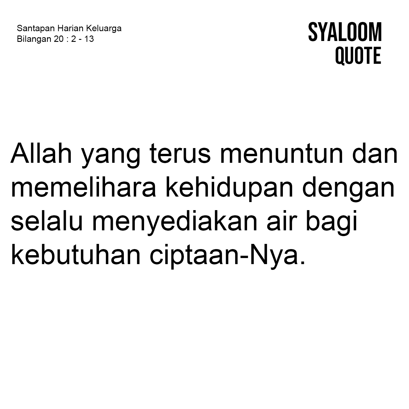 Tuhan Allah selalu menjaga keberlanjutan kehidupan seluruh ciptaan. Dalam nas ini disampaikan demikian, bahwa umat Israel yang melakukan perjalanan di padang gurun merasakan haus. Kehausan itu membuat mereka melakukan protes terhadap Musa dan Harun. Dalam pandangan bangsa Israel, sebagai pemimpin yang ditunjuk oleh Allah maka Musa dan Harun harus bertanggung jawab atas situasi krisis yang terjadi. Menyikapi kondisi itu maka Musa dan Harun memohon kepada Allah di pintu Kemah Pertemuan agar berkenan memberikan air, sehingga mereka dapat bertahan hidup. Dalam keadaan itu, hakekat Tuhan sebagai Allah yang merawat kehidupan dinampakan. Allah memerintahkan untuk mengumpulkan umat dan menyampaikan kepada bukit batu untuk mengeluarkan air. Perintah tersebut agar menjadi pengingat kebenaran, bahwa Allah yang memberi air sebagai bentuk pemeliharaan-Nya. Ironinya, Musa dan Harun justru mempertanyakan di depan umat: apakah kami harus mengeluarkan air bagimu dari bukit batu ini?. Pertanyaan itu adalah bentuk ketidakpercayaan dan keraguan atas pemeliharaan Allah. Lalu bagaimana dengan kita? Apakah kita juga meragukan kebenaran bahwa Allah akan tetap menolong dan memelihara hidup kita? Percayalah, bahwa Allah tidak akan meninggalkan ciptaan-Nya sendiri. Allah yang telah mencipta adalah Allah yang terus menuntun dan memelihara kehidupan dengan selalu menyediakan air bagi kebutuhan ciptaan-Nya.