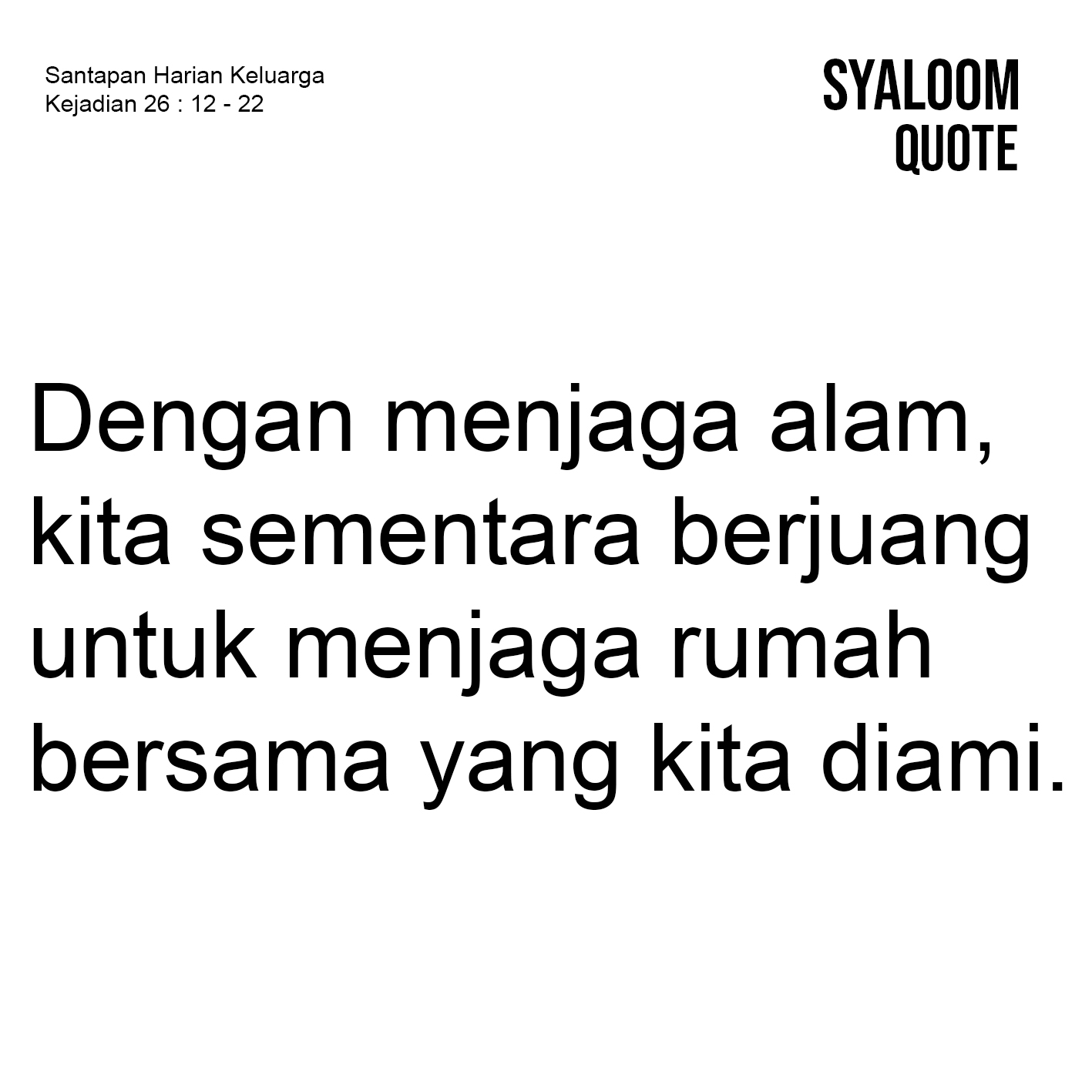 Sejak penciptaan langit dan bumi, manusia diberikan mandat dari Tuhan untuk “Berkuasa” (bnd. Kejadian 1:28). Mandat untuk “Berkuasa” dari Tuhan kemudian salah dipahami, sehingga terjadi kerusakan alam, karena sikap dominasi (power over) manusia. Manusia melupakan bahwa inti mandat Allah adalah menciptakan kesetaraan dan keutuhan hidup antar ciptaan serta panggilan untuk mengelola, merawat, dan melestarikan alam. Teks Kejadian 26:12-27 sebagai bahan perenungan semakin memberikan kita penyadaran tentang pentingnya merawat alam. Dalam teks diceritakan, bahwa negeri Filistin mendapat persoalan besar, yaitu mereka semua kelaparan. Ishak yang turut berada di negeri Filistin kemudian memutuskan mengelola tanah sebagai upaya untuk melanjutkan hidup. Disebutkan bahwa Ishak menabur di tanah dan pada tahun itu juga, ia mendapat hasil seratus kali lipat, dan ia menjadi kaya, bahkan kian lama kian kaya”. Tindakan Ishak memberikan pelajaran kepada kita di masa kini, bahwa alam adalah sumber kehidupan untuk seluruh ciptaan, karena telah diberkati oleh Tuhan. Sebagai manusia, kita patut bersyukur untuk anugerah tersebut. Dan sebagai bentuk ungkapan syukur, kita patut untuk menjaga dan merawat alam ciptaan ini. Dengan menjaga alam, kita sementara berjuang untuk menjaga rumah bersama yang kita diami. Dengan rumah yang aman maka seluruh ciptaan mampu terpelihara dengan baik.