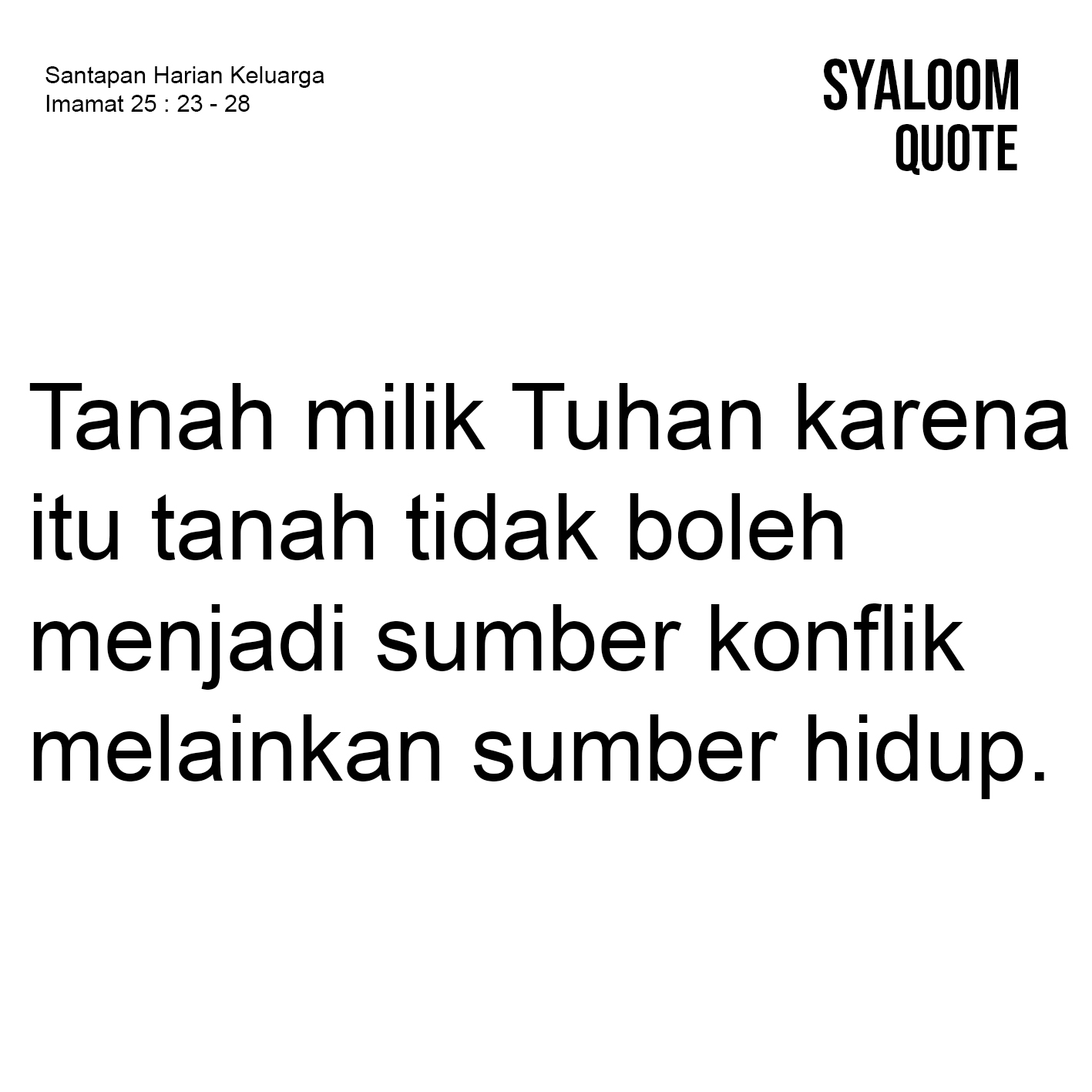 Saat ini, dapat dibilang bahwa tanah telah menjadi sumber konflik (sengketa). Dimana-mana terjadi masalah tanah yang berujung pada masalah sosial maupun masalah hukum. Orang “bakalai” (bertengkar) karena tanah, orang “bakusumpah” (saling menyumpahi) karena tanah, orang “bakubunuh” (saling membunuh) juga karena tanah. Kenapa? Karena tanah memiliki nilai investasi (harga) yang tinggi. Akibat harga jual tanah yang sangat fantastis tersebut membuat orang tidak segan-segan mengambil tanah milik orang lain, ada yang menjual tanah warisan secara sepihak, manupulasi sertifikat tanah, dan sebagainya. Persoalan tentang tanah juga terjadi pada saat bangsa Israel mendiami tanah Kanaan. Setiap suku Israel diberikan pembagian dan kepemilikan tanah untuk dikelola demi kesejahteraan hidup akan tetapi ada yang menjual tanah sehingga mereka kehilangan miliknya Karena itu, mereka diingatkan agar jangan menjual tanah secara mutlak karena Allahlah pemilik tanah (ay.23). Orang Kristen diingatkan bahwa tanah milik Tuhan karena itu tanah tidak boleh menjadi sumber konflik melainkan sumber hidup.