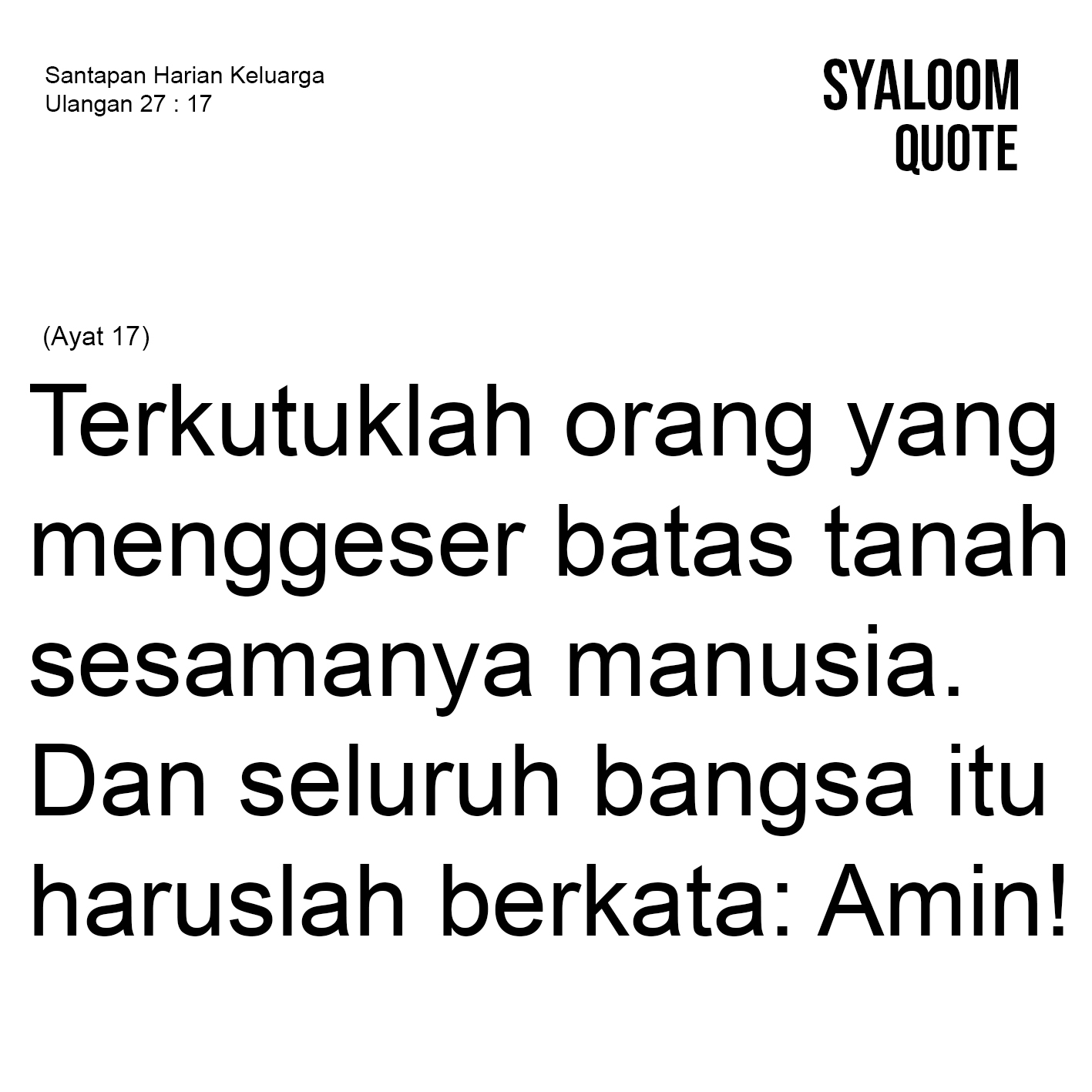 Praktek menggeser batas tanah sering kita jumpai dalam kehidupan sehari-hari. Ada pihak-pihak tertentu yang dengan curang menggeser batas tanah atau patok yang telah dibuat dari si pemilik yang sah. Padahal praktek tersebut dapat diancam pidana. (Pasal 383 KUHP) Larangan tentang menggeser batas tanah milik orang lain pun sudah disampaikan oleh Musa pada zaman lampau. Larangan ini bermaksud agar bangsa Israel tidak semena-mena terhadap milik sesamanya. Dan apabila Israel melanggar perintah tersebut akan membawa konsekuensi buruk bagi kehidupan mereka yakni kutuk. Kutuk ini disampaikan oleh imam dan akan disahut dengan kata “amin” oleh segenap umat Israel (ay.17). Hal ini dilakukan agar umat Israel hidup taat sesuai perintah Tuhan (Ul.30:19). Pesan nas ini bagi kita adalah bahwa kita tidak boleh menggeser batas tanah orang lain sebagai pemilik sah karena hal itu bukanlah perbuatan kebenaran. Tindakan tersebut dapat saja mendatangkan persoalan yang berujung pada hukuman pidana. Tentu kita tidak menginginkan hukuman Tuhan. Maka mari kita berlaku jujur di hadapanNya, termasuk jujur terhadap batas-batas tanah.