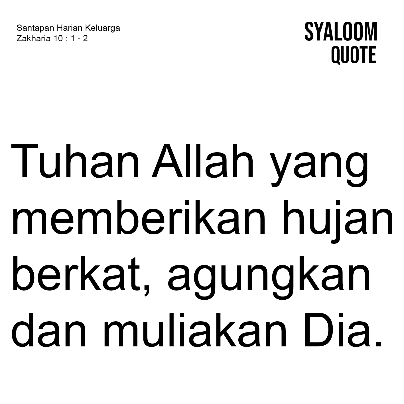Allah Sang Pencipta yang telah menciptakan langit dan bumi serta segala isinya demi kesejahteraan semua makhluk adalah bukti cinta dan sayangnya bagi kita sebagai manusia. Allah telah mengatur dengan begitu baik alam ciptaan dengan tugas dan fungsinya masing-masing. Kalau ada musim panas, tentu saatnya juga sesuai waktunya akan tiba musim hujan. Yang mengaturnya adalah Tuhan Allah Sang Pencipta. Dalam nas firman Tuhan di hari ini, nabi Zakharia menghimbau kepada umat Israel agar mereka meminta hujan dari Tuhan. Sebab Tuhanlah yang membuat awan-awan sebagai pembawa hujan deras, sehingga daripadanya tumbuh-tumbuhan akan hidup dan bertumbuh di padang untuk menghidupkan semua orang. Himbauan dan peringatan nabi Zakharia ini agar umat sadar akan kemahakuasaan Allah. Jangan mereka memakai kekuatan di luar Allah dengan menanyakan kepada terafim yang jahat dan yang juru-juru tenung yang penuh dusta dan hampa. Realita seperti ini terus terjadi sampai saat ini. Ada upaya untuk meminta hujan dan menghentikannya dengan memakai pawang hujan. Hal itu tentu mendukakan hati Allah dan menjadi teguran keras bagi kita semua. Kita mesti mengagungkan dan memuliakan Tuhan Allah yang memberikan hujan berkat, sebagaimana ungkapan pujian kita kepadaNya.