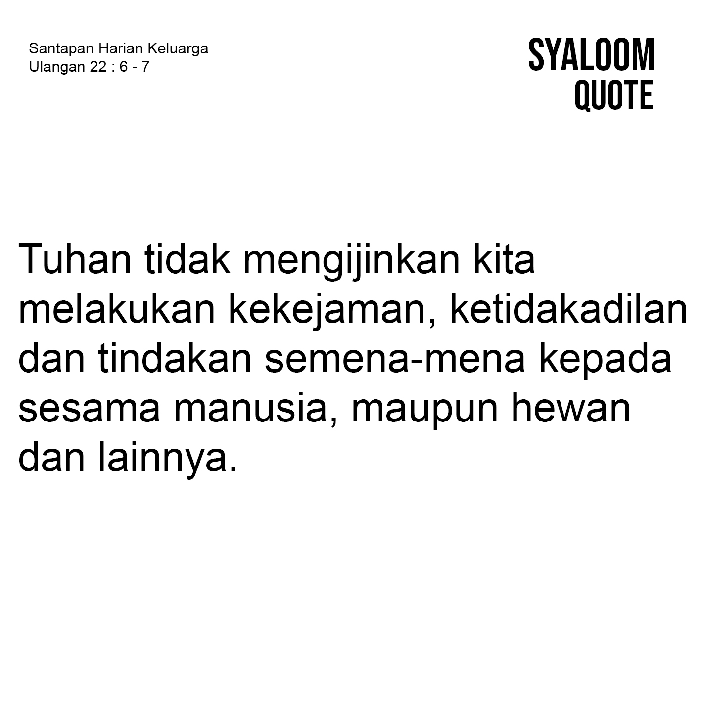 Tak berkesudahan kasih setia Tuhan, tak habis-habisnya rahmatNya, selalu baru tiap pagi. Demikianlah pengakuan iman kita semua, yang meyakini bahwa kehidupan kita hingga hari ini adalah berkat kasih setia Tuhan. Rahmat Tuhan ini tidak hanya berlaku bagi kita melainkan juga ciptaan Tuhan lainnya. Penulis kitab Ulangan menyampaikan dalam bacaan hari ini berbagai aturan supaya kita memiliki hidup yang berbelaskasih bagi sesama manusia dan hewan, serta menjauhkan diri dari hal-hal yang tidak benar. Larangan untuk tidak boleh mengambil dan membunuh anak-anak burung adalah demi kelangsungan hidup burung-burung itu hingga menjadi besar. Janganlah kita berpura-pura untuk tidak memperhatikan sesama ciptaan Tuhan, apalagi merusak dan menghancurkan hidup mereka. Tidak ingatkah, bahwa di balik kehidupan mereka, ada berkat yang Tuhan sediakan bagi kita manusia? Sebab itu bukan saja soal mempedulikan, tetapi di tuntut untuk memahami apa yang menjadi kepunyaan kita dan yang bukan.Tuhan tidak mengijinkan kita melakukan kekejaman, ketidakadilan dan tindakan semena-mena kepada sesama manusia, maupun hewan dan lainnya. Kita harus menjadi orang-orang yang bertanggungjawab, berhati peduli dan penuh belas kasih demi hidup berkelanjutan.