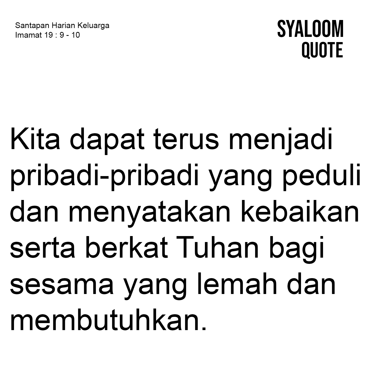 Tuhan selalu memanggil kita untuk memperhatikan mereka yang membutuhkan. Dalam beberapa hukum yang disampaikan-Nya melalui Musa, Allah memerintahkan umat-Nya untuk tidak menuai sampai habis, melainkan meninggalkan sisa tuaian untuk orang miskin dan orang asing (Ay.10). Allah ingin umat-Nya memperhatikan dan menyediakan kebutuhan bagi orang-orang yang berkekurangan di tengah-tengah mereka. Dengan melakukan hal demikian, mereka telah menjaga keberlangsungan hidup saudara-saudara yang lemah dan membutuhkan. Hukum ini mungkin semakin sulit diterapkan di zaman sekarang. Semangat individualis membuat orang menjadi kurang peduli kepada sesama. Apalagi tekanan ekonomi dan pemenuhan kebutuhan semakin banyak, orang memusatkan tindakan demi mencari untung belaka. Situasi ini menyulitkan untuk menunjukkan belas kasihan kepada mereka yang miskin dan lemah. Meskipun begitu hari ini firman Tuhan kembali mengingatkan bahwa di sekitar kita ada banyak saudara yang sungguh membutuhkan. Pada kita ada berkat yang dari Tuhan. Maka sesungguhnya kita pun masih memiliki kesempatan untuk menjadi penyalur berkat Tuhan bagi mereka. Kita dapat terus menjadi pribadi-pribadi yang peduli dan menyatakan kebaikan serta berkat Tuhan bagi sesama yang lemah dan membutuhkan.