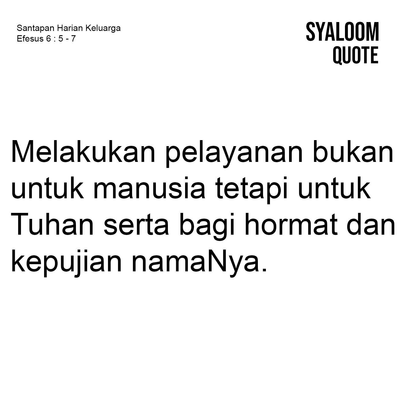 Setiap pekerjaan maupun usaha yang kita lakukan hendaknya didasari pada pemahaman bahwa semuanya itu ditujukan untuk Tuhan dan kemuliaan namaNya. Hal ini dinasehati oleh Rasul Paulus dalam surat pastoralnya kepada jemaat di Efesus terkhusus kepada para hamba. Mereka ini adalah bawahan, sehingga pasti tunduk kepada tuan karena ada bayaran atau upah. Hal tersebut merupakan suatu kewajaran dan kewajiban, sebab mereka telah bekerja kepada tuannya. Namun nasehat ini mengingatkan bahwa tujuan mereka bekerja seharusnya bukan upah atau uang semata, namun merupakan wujud iman dan ketaatan kepada Tuhan. Nasehat tersebut juga penting bagi kita sebagai keluarga Allah dalam melaksanakan seluruh tugas dan pelayanan. Hendaknya kita melakukannya dengan ketulusan hati dan sukacita sebab kita melakukan bukan untuk manusia tetapi untuk Tuhan serta bagi hormat dan kepujian namaNya.