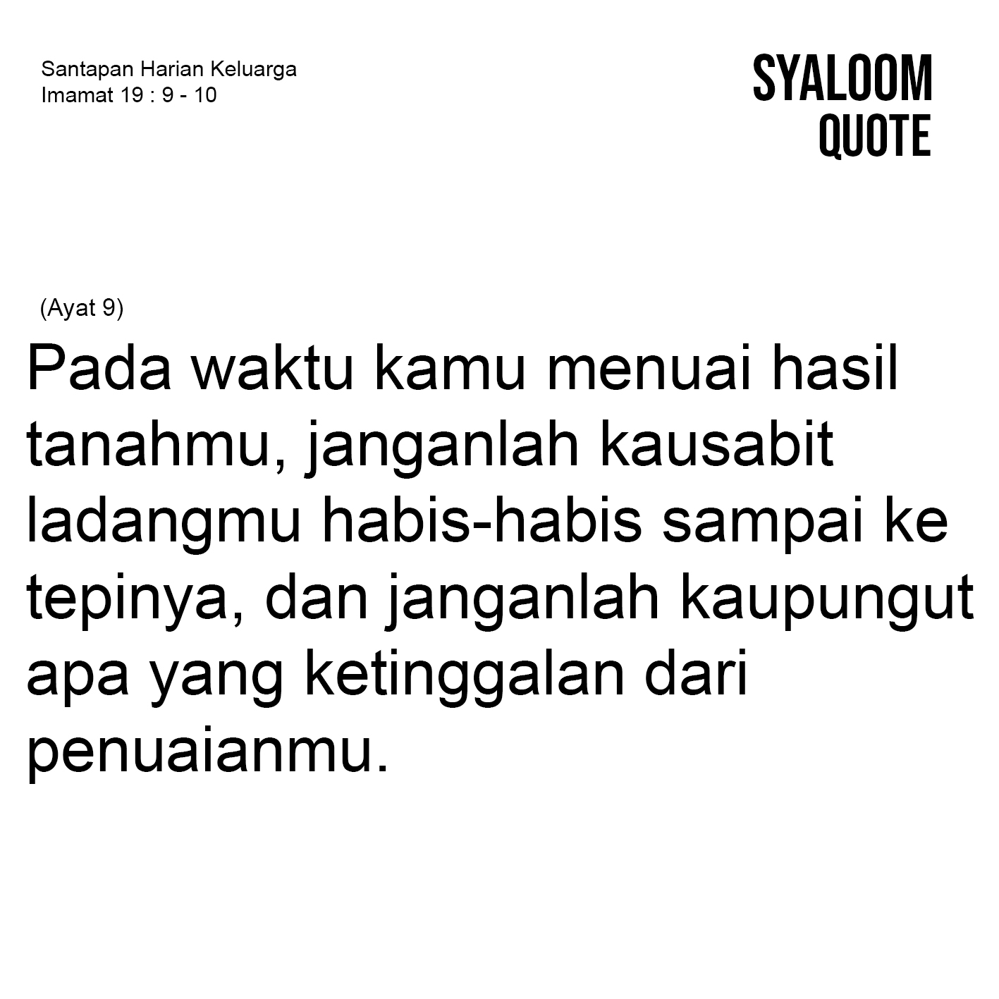 Tuhan selalu memanggil kita untuk memperhatikan mereka yang membutuhkan. Dalam beberapa hukum yang disampaikan-Nya melalui Musa, Allah memerintahkan umat-Nya untuk tidak menuai sampai habis, melainkan meninggalkan sisa tuaian untuk orang miskin dan orang asing (Ay.10). Allah ingin umat-Nya memperhatikan dan menyediakan kebutuhan bagi orang-orang yang berkekurangan di tengah-tengah mereka. Dengan melakukan hal demikian, mereka telah menjaga keberlangsungan hidup saudara-saudara yang lemah dan membutuhkan. Hukum ini mungkin semakin sulit diterapkan di zaman sekarang. Semangat individualis membuat orang menjadi kurang peduli kepada sesama. Apalagi tekanan ekonomi dan pemenuhan kebutuhan semakin banyak, orang memusatkan tindakan demi mencari untung belaka. Situasi ini menyulitkan untuk menunjukkan belas kasihan kepada mereka yang miskin dan lemah. Meskipun begitu hari ini firman Tuhan kembali mengingatkan bahwa di sekitar kita ada banyak saudara yang sungguh membutuhkan. Pada kita ada berkat yang dari Tuhan. Maka sesungguhnya kita pun masih memiliki kesempatan untuk menjadi penyalur berkat Tuhan bagi mereka. Kita dapat terus menjadi pribadi-pribadi yang peduli dan menyatakan kebaikan serta berkat Tuhan bagi sesama yang lemah dan membutuhkan.