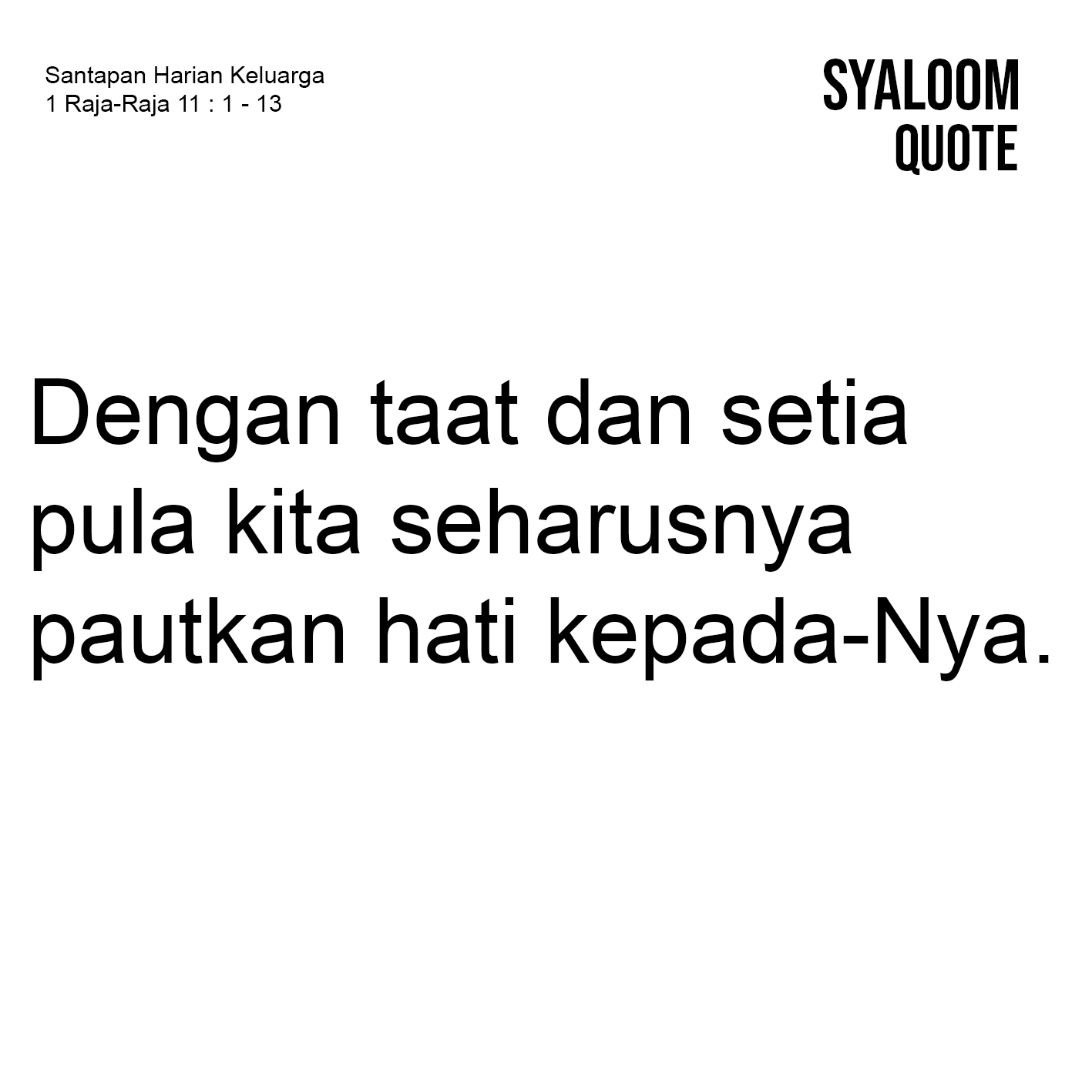 Perubahan zaman dewasa ini dapat memberikan pengaruh terhadap berbagai aspek kehidupan tetapi juga hidup beriman kita, baik positif maupun negatif. Pengaruh yang dimaksudkan juga dialami oleh Salomo ketika menduduki tahta kerajaan mengantikan ayahnya Daud. Awalnya Salomo adalah seorang yang taat dan setia sehingga hikmat Allah diberikan kepadanya. Namun karena kepentingan politiknya, ia mulai tidak setia dan berpaling dari Tuhan dengan beribadah kepada ilah-ilah yang disembah oleh istri-istrinya. Akibatnya, kerajaan Salomo mulai menghadapi berbagai persoalan yang berasal dari musuh-musuhnya, baik dari dalam maupun dari luar Israel. Kecenderungan Salomo yang meninggalkan Allah karena suatu kepentingan juga pernah dilakukan oleh kita baik disengaja maupun tidak disengaja. Tanpa sadar sikap, perkataan dan perbuatan yang kita lakukan sesungguhnya menunjukkan kecenderungan kita kepada kepentingan diri sendiri atau kelompok, sehingga secara tidak langgsung tidak mencondongkan diri lagi kepada Allah. Belajar dari pengalaman hidup Salomo yang menanggung murka Allah akibat ketidaktaatan dan ketidaksetiaannya, maka kita tidak boleh berlaku demikian. Sebab Allah yang kita sembah tidak berkompromi dengan pelanggaran-pelanggaran kita. Karena itu, sebagaimana ungkapan percaya kita kepada Allah maka dengan taat dan setia pula kita seharusnya pautkan hati kepada-Nya.