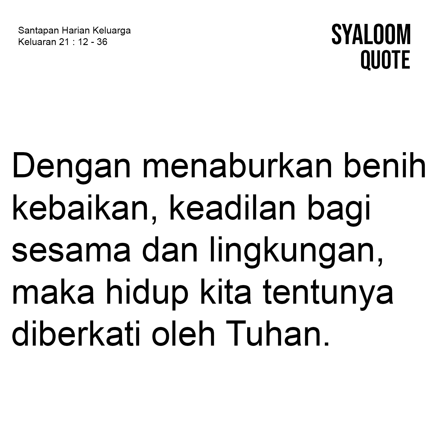 Firman Tuhan hari ini mengingatkan kita bahwa melakukan kejahatan terhadap sesama merupakan hal yang tidak dikehendaki Tuhan dan ada hukuman untuk hal itu. (ay.12-14). Oleh karena itu kita diarahkan untuk menghindari kejahatan. Hukum yang tertulis dalam nas ini tidak membenarkan atau mengizinkan aksi balas dendam seperti yang dikatakan: “mata ganti mata, gigi ganti gigi dst ”. Hukum ini justru menjadi dasar bagi para hakim untuk menjatuhkan hukuman yang setimpal dan seadil-adilnya bagi para pelaku kejahatan. Dengan adanya hukum ini orang akan berpikir dua kali sebelum melakukan sesuatu yang mencelakai orang lain. Ini merupakan pengajaran yang harus dihidupi oleh setiap kita, bahwa sesungguhnya Tuhan membenci kekerasan dan kejahatan. Ia menginginkan kedamaian dan cinta kasih. Hukum ini membantu kita pula untuk melihat realita sosial, ketika banyak ketidakadilan terjadi di mana-mana. Sebagai orang-orang yang berkepentingan mengatur kehidupan orang lain, maka jadilah bijak dalam pengambilan keputusan bagi keberlangsungan semua mahkluk. Dengan menaburkan benih kebaikan, keadilan bagi sesama dan lingkungan, maka hidup kita tentunya diberkati oleh Tuhan.