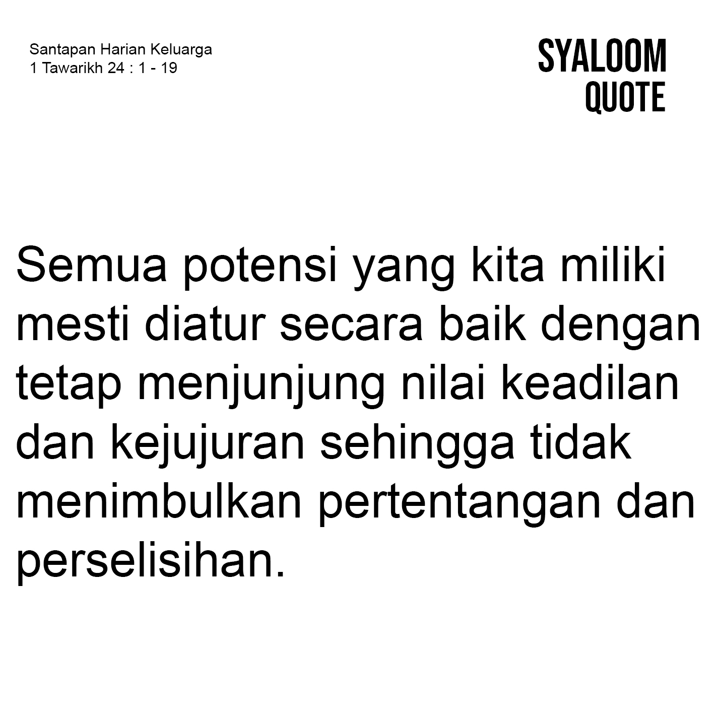 Semua orang dikarunia kemampuan serta potensi dari Tuhan untuk didayagunakan demi kehidupan bersama dan hormat kepujian nama Tuhan. Di Israel, suku Lewi diberikan tugas untuk melayani Tuhan dan pekerjaanNya di kemah pertemuan. Dari suku ini, jabatan imam ada pada Harun dan anak-anaknya, diantaranya Eleazar dan Itamar. Dari mereka berdua dibagi lagi dalam kelompok-kelompok kecil yang dilakukan dengan cara membuang undi. Cara pengundian pada masa itu adalah untuk menjaga nilai keadilan dan kejujuran. Hal ini penting untuk menjaga kekudusan baik pelayan maupun umat dalam melayani Tuhan dan pekerjaanNya. Semua hal menyangkut peribadahan diatur sedemikian rupa dengan tujuan untuk membangun persekutuan yang memuliakan Tuhan. Keteladanan ini harus kita wujudkan dalam seluruh tanggung jawab pekerjaan serta pelayanan di masa sekarang. Semua potensi yang kita miliki mesti diatur secara baik dengan tetap menjunjung nilai keadilan dan kejujuran sehingga tidak menimbulkan pertentangan dan perselisihan. Sebaliknya, akan menciptakan persekutuan hyang indah dan harmonis demi kepujian nama Tuhan.