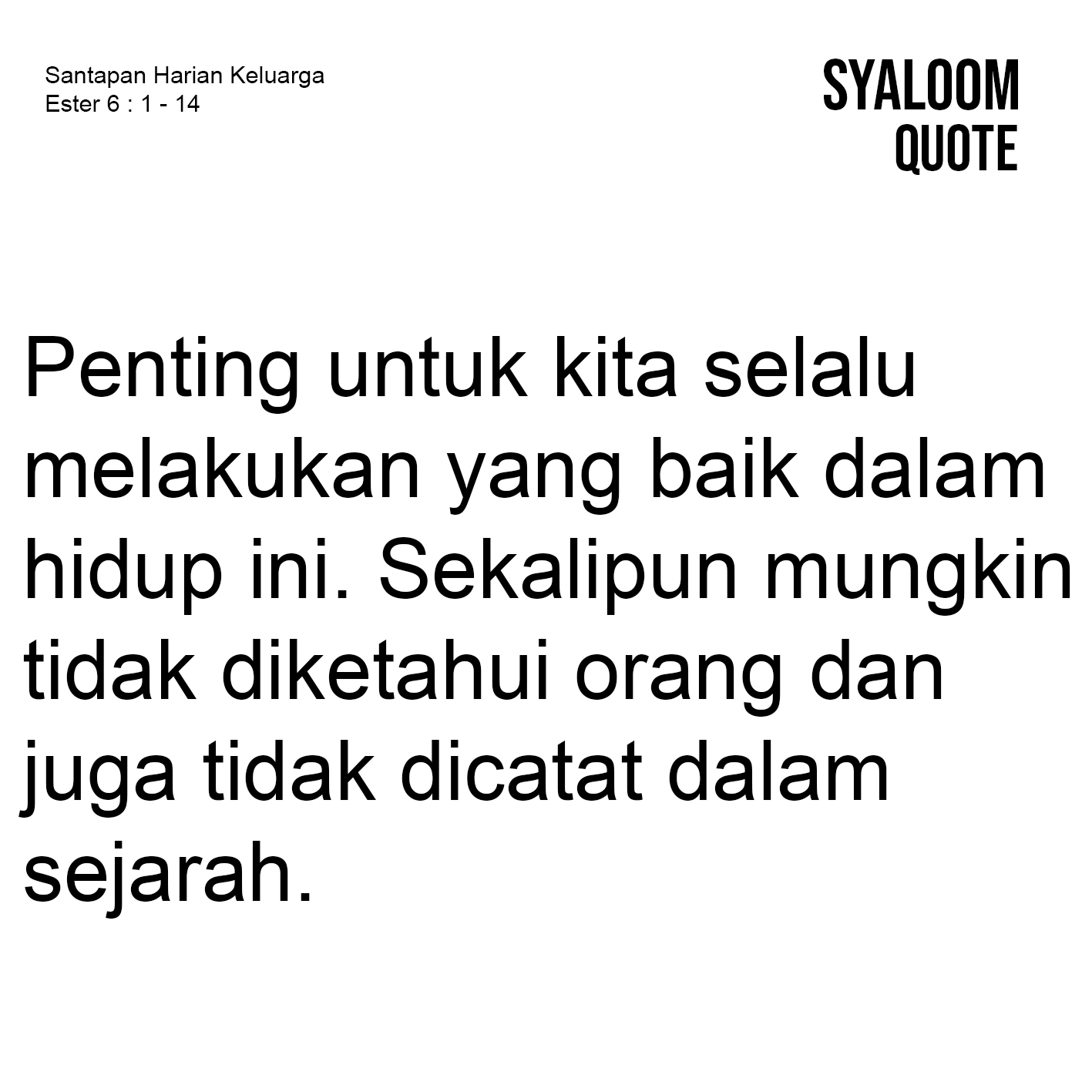 Saya tidak bisa mengubah sejarah, saya tidak ingin mengubahnya. Saya hanya ingin mengubah masa depan, dan saya sedang mengerjakannya” demikian kata-kata Boris Frans Becker, mantan petenis nomor satu dunia asal Jerman. Kata-kata Becker ini mirip dengan sejarah perjalanan hidup Mordekhai yang tidak menyangka akan mendapat penghargaan tertinggi dari raja Ahasyweros saat raja membuka dokumen sejarah yang mencatat bahwa ia pernah menyelamatkan raja. Mordekhai memberi informasi tentang rencana pembunuhan raja kepada dua orang pengawal raja. Catatan sejarah ini membawa masa depan baru bagi Mordekhai ketika ia menggantikan Haman yang dihukum gantung karena kebencian serta rencana jahatnya kepada Mordekhai dan orang Yahudi. Sebuah teladan bagi kita, bahwa pentingnya untuk kita selalu melakukan yang baik dalam hidup ini. Sekalipun mungkin tidak diketahui orang dan juga tidak dicatat dalam sejarah sebab kita hanyalah orang “kecil”. Namun kita mesti yakin bahwa akan selalu tercatat oleh Allah Sang Pencipta dalam cacatan Ilahi. Hal tersebut akan membawa kebahagian dan sukacita bagi kita pada suatu saat kelak. Untuk itu teruslah berbuat baik bagi semua orang dalam kehidupan kita sebagai orang percaya.