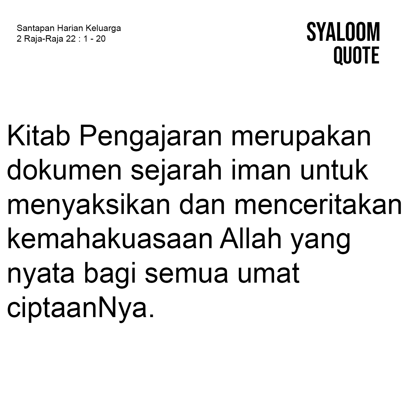 Ditemukannya kitab Taurat oleh imam besar Hilkia saat para pekerja sementara memperbaiki rumah Tuhan, membuat raja Yosia segera meminta petunjuk Tuhan melalui seorang nabiah yang tinggal di Yerusalem. Yosia adalah raja Yehuda yang memerintah di usia muda yakni delapan tahun. Sekalipun muda, Yosia berlaku benar di mata Tuhan seperti Daud bapa leluhurnya. Ia mengoyakkan pakaiannya saat Safan, panitera membacakan kitab yang ditemukan itu, sebagai tanda penyesalan dan menangis akibat dosa dan kecemaran leluhurnya dengan menyembah kepada allah lain dan menimbulkan sakit hati Tuhan. Sikap Yosia ini mendapat simpatik Tuhan dengan menubuatkan bahwa ia akan mendapat tempat saat meninggal dunia bersama dengan para leluhurnya dan ia tidak akan mengalami pengukuman Tuhan atas Bangsa Israel. Sebuah teladan bagi kita bahwa Kitab Pengajaran merupakan juga dokumen sejarah iman untuk menyaksikan dan menceritakan kemahakuasaan Allah yang nyata bagi semua umat ciptaanNya. Firman Tuhan itu memberikan petunjuk agar kita mau menjadi anak-anak Tuhan yang selalu hidup dalam pembaharuan dan pertobatan hidup.