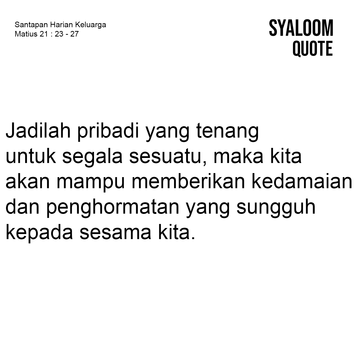 rotes terhadap pelayanan Yesus selalu berdatangan dari Imam-imam kepala dan tua-tua bangsa Yahudi. Sebagaimana catatan Kitab-kitab injil, kelompok-kelompok itu meragukan dan tidak mempercayai Yesus adalah Anak Allah; Sang Mesias yang dijanjikan itu. Matius 21: 23-27 merupakan salah satu teks yang menampilkan upaya kelompok tersebut membangun relasi dengan Yesus. Tergambarkan relasi mereka didasarkan pada keraguan dan niat jahat untuk menjatuhkan/mempermalukan Yesus (bnd. Pertanyaan imam kepala dan tua bangsa Yahudi pada ayat 23). Namun menariknya, Yesus tidak menanggapi kelompok tersebut dengan kekerasan. Justru sebaliknya, Yesus menampilkan sikap tenang yang kokoh, sehingga Ia tidak mempermalukan mereka. Yesus menerima dan menghormati mereka, sambil berusaha membenahi pikiran mereka yang bertentangan dengan kebenaran Allah. Catatan menarik untuk kita di saat ini, sebagai manusia kita akan selalu berelasi dengan sesama. Karena itu, ketenangan diri untuk berkata dan menanggapi perkataan orang lain harus menjadi pilihan sikap yang bijak. Jadi, dimanapun, kapanpun, dan dengan siapapun kita berelasi, kita akan mampu memberikan kedamaian dan penghormatan yang sungguh kepada sesama kita.