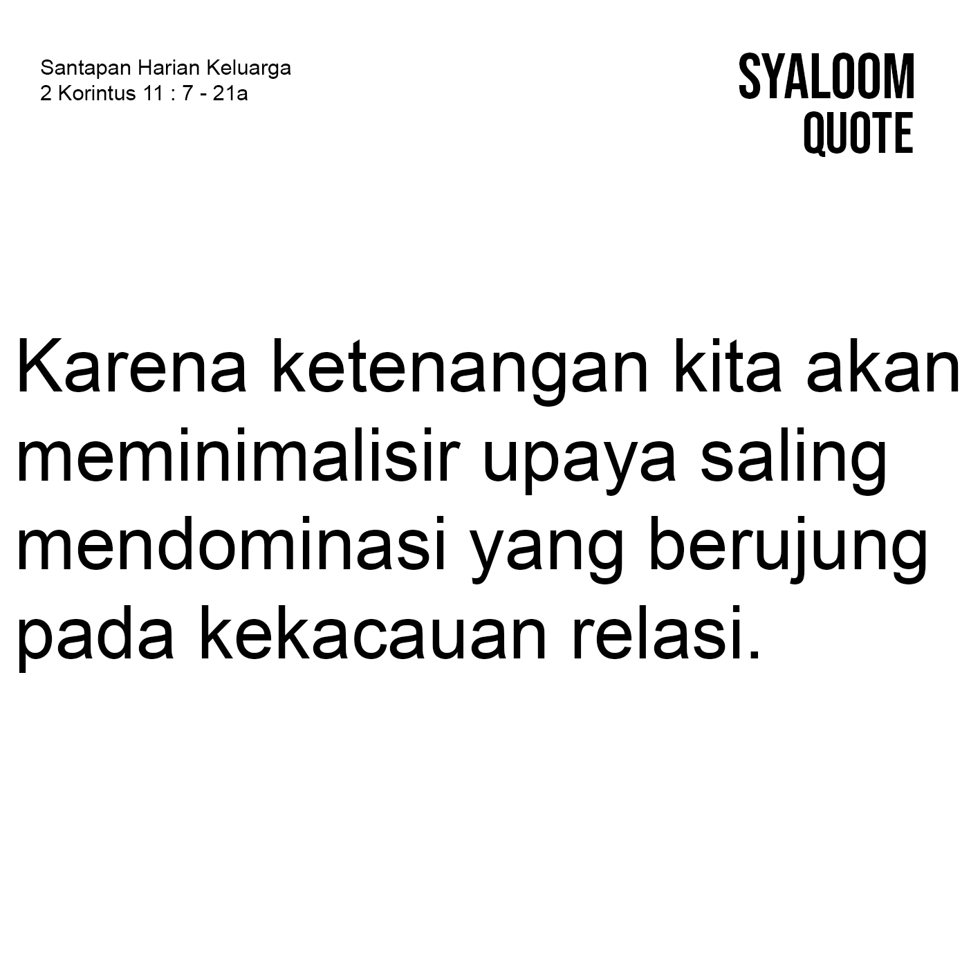 Sikap mendominasi cenderung menjadi wajah relasi dan dialog di masa kini. Beberapa orang terkesan memuji diri sendiri dan menganggap yang lain lebih rendah dari dirinya. Bahkan ungkapan “Kamu bodoh” sering dijumpai sebagai salah satu bentuk nyata upaya mendominasi dalam proses dialog. Kenyataan yang sama turut diperlihatkan dalam teks 2 Korintus 11: 7-21a. Diperlihatkan, bahwa kedatangan rasul-rasul palsu di Korintus telah menyebabkan Paulus dikenal sebagai orang bodoh (bnd. Ay. 16). Namun menarik, bahwa di tengah gempuran kekerasan verbal, Paulus tidak membalas mereka. Justru Paulus mengatakan, bahwa dirinya akan tetap menerima jika jemaat Korintus turut menganggap dirinya sebagai seorang yang bodoh. Kerendahan hati dan ketenangan Paulus untuk tidak membalas kekerasan verbal orang lain harus juga kita maknai di masa kini. Sekalipun kita direndahkan atau dianggap lemah oleh orang lain, marilah kita menjadi pribadi yang tenang untuk menanggapinya. Karena ketenangan kita akan meminimalisir upaya saling mendominasi yang berujung pada kekacauan relasi. Pada akhirnya, relasi tetap terjaga dalam bingkai penerimaan dan penghormatan.