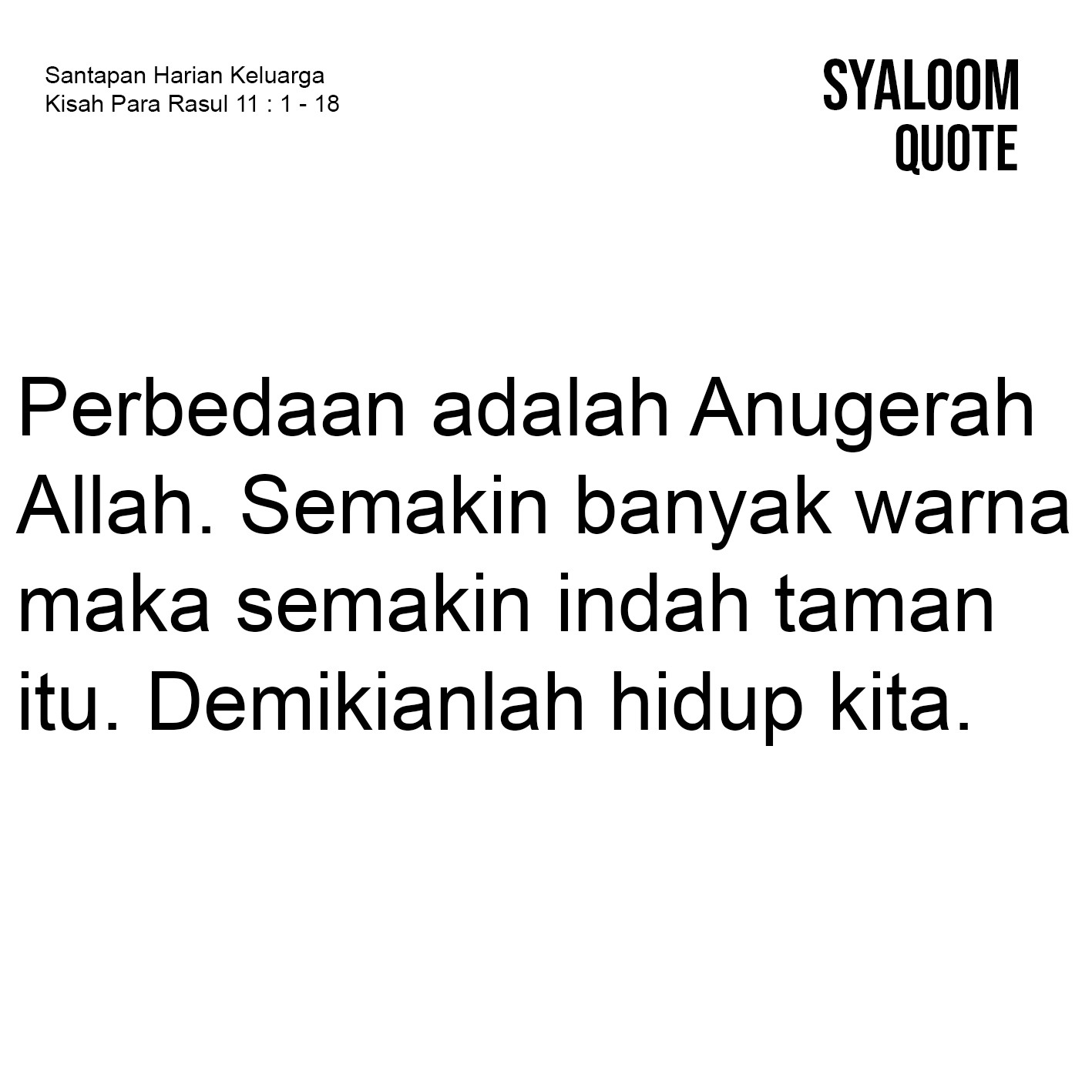 Rasanya, pertentangan antara kelompok yang Yahudi dan non Yahudi tidak pernah berkesudahan pada awal-awal masa pertumbuhan gereja. Seorang Yahudi yang dekat, diam di rumah, dan makan sehidangan dengan orang non Yahudi akan dilabeli sebagai seorang kafir/haram (bnd. Ay. 3). Orang Yahudi meyakini, bahwa pertobatan, keselamatan, dan berkat Allah hanya ditujukan kepada mereka, bukan yang lain. Padahal, kepada bangsa-bangsa lain, Allah turut mengaruniakan pertobatan yang memimpin kepada hidup (bnd. Ay. 18). Petrus yang mendapat pertentangan karena telah melakukan pembaptisan kepada Kornelius di Yerusalem turut menegaskan, bahwa apa yang dilakukannya dihalalkan oleh Allah (bnd. Ay. 9). Jawaban Petrus turut menjadi kritik dan panggilan kepada kita di masa kini, bahwa perbedaan golongan, ras, suku, dan kepercayaan jangan menjadi pemecah kehidupan bersama. Justru sebaliknya, perbedaan harus dipandang sebagai anugerah Allah yang membawa kehidupan. Ingatlah, bahwa taman yang indah tidak pernah terisi oleh 1 warna tunggal, melainkan oleh beragam warna. Semakin banyak warna maka semakin indah taman itu. Demikianlah hidup kita.