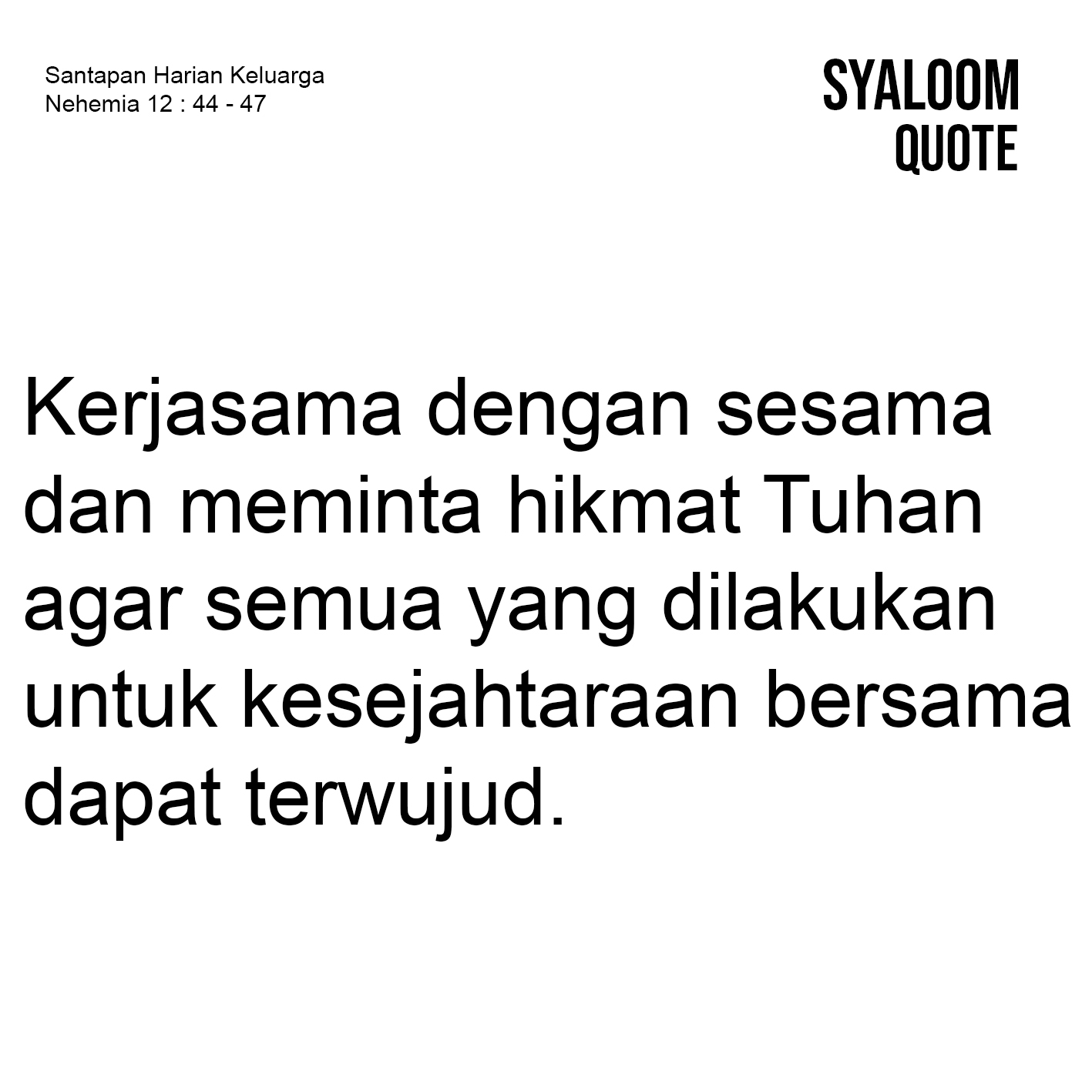 Tugas Nehemia sebagai bupati bukan saja untuk membangun tembok Yerusalem yang runtuh, namun juga memperhatikan jaminan hidup para imam dan orang-orang Lewi yang bertugas dalam pelayanan pekerjaan Tuhan. Hal tersebut dilakukan dengan mengangkat beberapa orang yang bertugas mengawasi bilik-bilik perbendaharaan, persembahan khusus, hasil pertama dan persepuluhan sesuai dengan ladang setiap kota. Hal ini diatur dengan baik sebagai bentuk sukacita umat karena pekerjaan untuk melayani Tuhan dilaksanakan dengan sungguh-sungguh oleh para imam, kaum Lewi serta juga para penyanyi dan penunggu pintu gerbang. Pesan nas hari ini bagi kita adalah pentingnya membangun relasi antar sesama yang dengan baik demi mewujudkan tugas dan tanggungjawab pekerjaan Tuhan untuk kesejahteraan bersama. Kita tidak dapat melakukan sutau pekerjaan seorang diri. Kita butuh kerjasama dengan sesama dan meminta hikmat Tuhan agar semua yang dilakukan untuk kesejahtaraan bersama dapat terwujud.