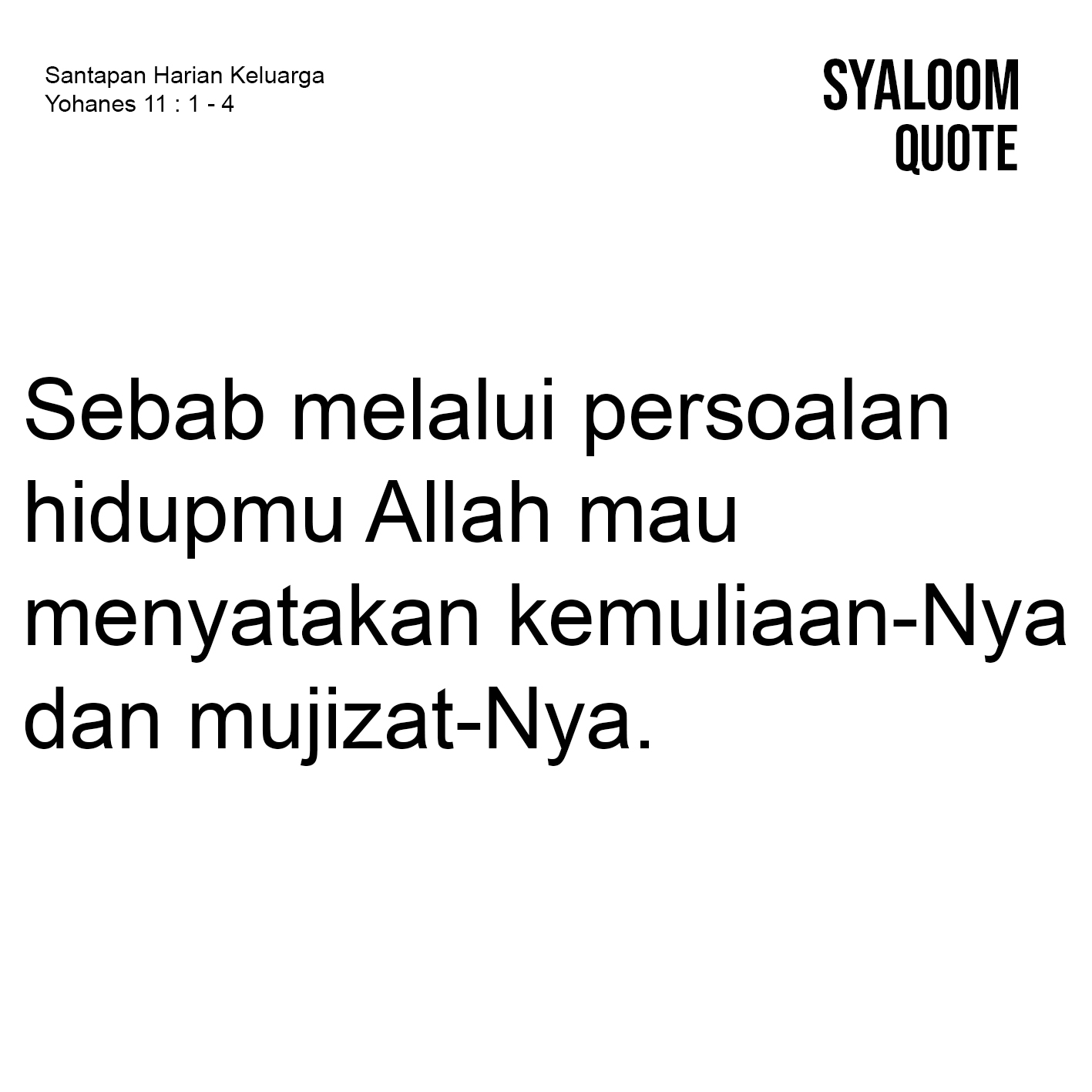Semua manusia, baik selaku pribadi atau keluarga, pasti mengalami persoalan dalam hidup. Persoalan-persoalan itu beraneka ragam yakni ekonomi, pekerjaan dan usaha, kesehatan dan masih banyak lagi yang lain. Kita pasti pernah mengalaminya, atau bisa saja kita sekarang sedang berjuang untuk keluar dari persoalan-persoalan itu. Meskipun demikian, persoalan-persoalan yang dialami tidak akan menghancurkan, membahayakan, atau membinasakan kita, justru melalui persoalan itu kemuliaan Allah dinyatakan (ay.4). Hal ini menunjukkan apapun keadaannya, Allah tidak pernah jauh dari hidup kita. Allah tidak pernah meninggalkan kita sendirian meskipun kita berada di dalam kesesakan, Allah selalu hadir untuk mendampingi kita. Mengapa demikian? sebab melalui persoalan hidupmu Allah mau menyatakan kemuliaan-Nya dan mujizat-Nya di dalam dirimu saat ini juga. Di dalam persoalan hidup Allah yang berkuasa menyatakan kuasanya agar manusia tunduk pada kuasa Allah, dan memuliakan Allah.