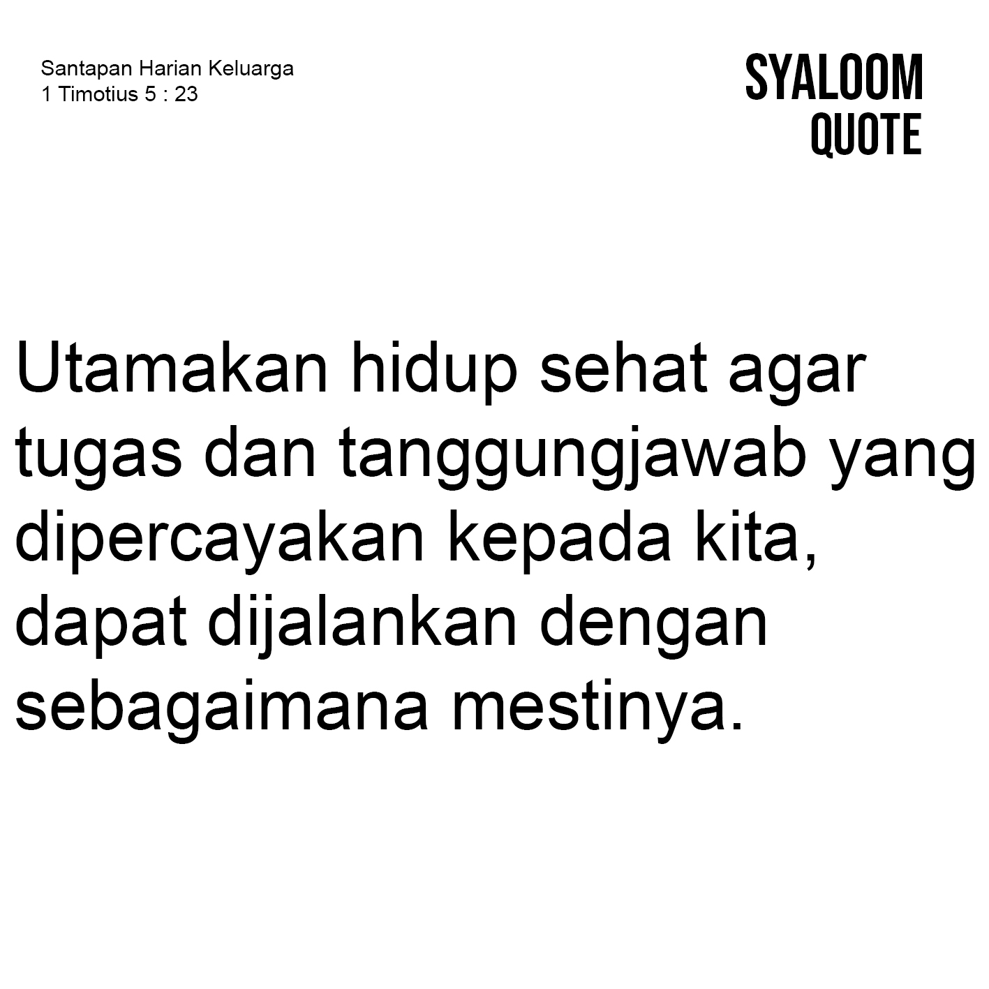 Memiliki tubuh yang sehat merupakan harapan semua orang. Namun harapan itu harus ditopang dengan pola hidup yang sehat. Sebab dengan menjalankan pola hidup sehat maka kita dapat memiliki tubuh yang sehat pula. Kesehatan adalah hal yang penting dan harus dijaga, itu sebabnya rasul Paulus turut menasihati Timotius supaya menjaga kesehatannya. Sebab ada banyak hal yang akan ikut terganggu termasuk pelayanan jika tubuh tidak sehat. Ini berkaitan dengan kondisi Timotius yang mengalami gangguan pada pencernaannya dan tubuh yang sering lemah. Terhadap hal itu rasul Paulus menyampaikan kepadanya supaya janganlah lagi minum air saja, melainkan tambahkanlah anggur sedikit. Artinya ada upaya yang harus dilakukan untuk tetap menjaga kesehatan. Kalimat tambahkan sedikit anggur mununjukkan pemakaian anggur yang tidak banyak atau tidak berlebihan. Sebab jika berlebihan maka justru akan berpotensi merusak kesehatan. Oleh karena itu melalui firman ini kita semua diajarkan untuk menerapkan pola hidup sehat. Hal ini dapat dilakukan jika semua orang memiliki kesadaran akan pentingnya hidup sehat. Dalam kaitan dengan itu maka hikmat dari Allah diperlukan untuk menuntun dan mengarahkan cara berpikir kita. Terapkanlah pola hidup sehat dalam kehidupan tiap-tiap hari baik kepada pribadi maupun keluarga kita. sebab dengan begitu akan mengurangi resiko berbagai macam penyakit bahkan kematian dini. Utamakan hidup sehat agar semua hal yang berkaitan dengan tugas dan tanggungjawab yang dipercayakan kepada kita, dapat dijalankan dengan sebagaimana mestinya.