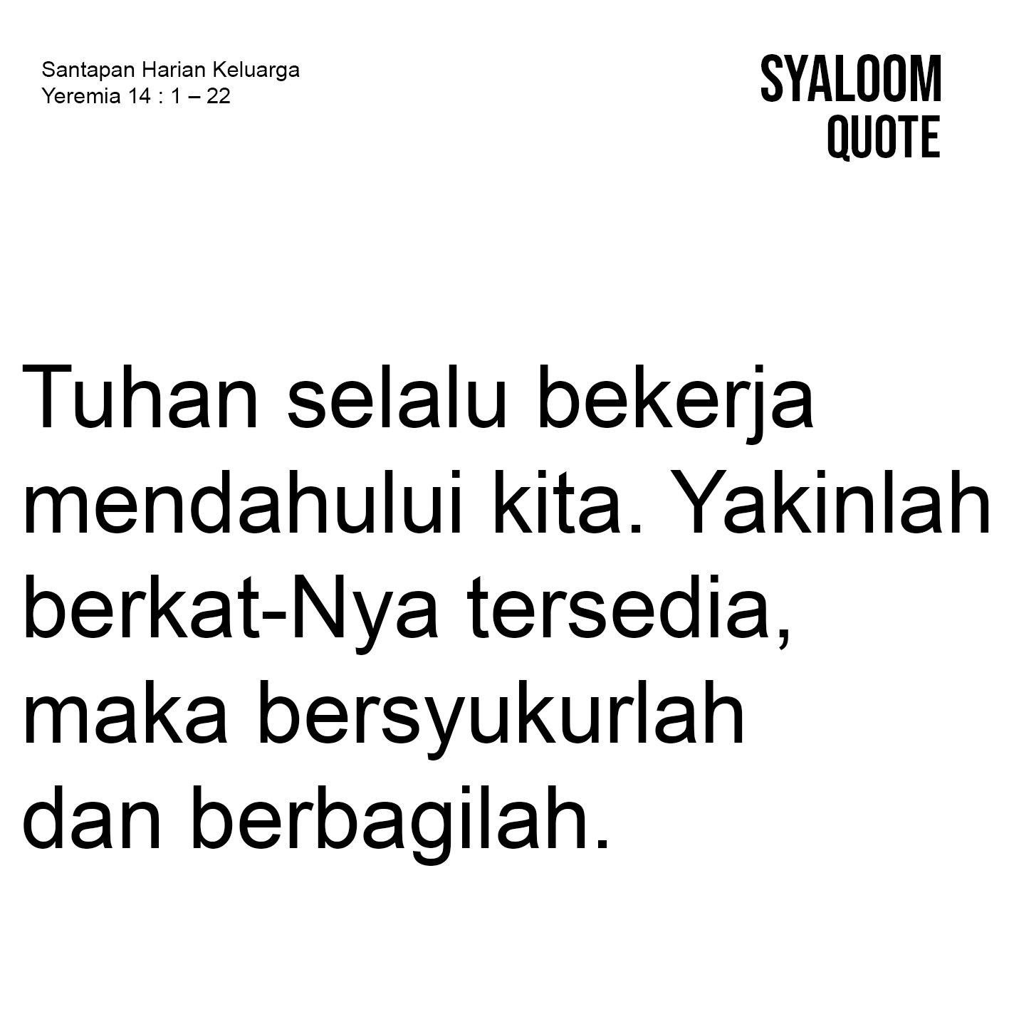 Tetapi ingatlah, Tuhan selalu bekerja mendahului kita. Tuhan terlalu baik untuk membiarkan kita tanpa pertolongan. Yakinlah berkat-Nya tersedia, maka bersyukurlah dan berbagilah.