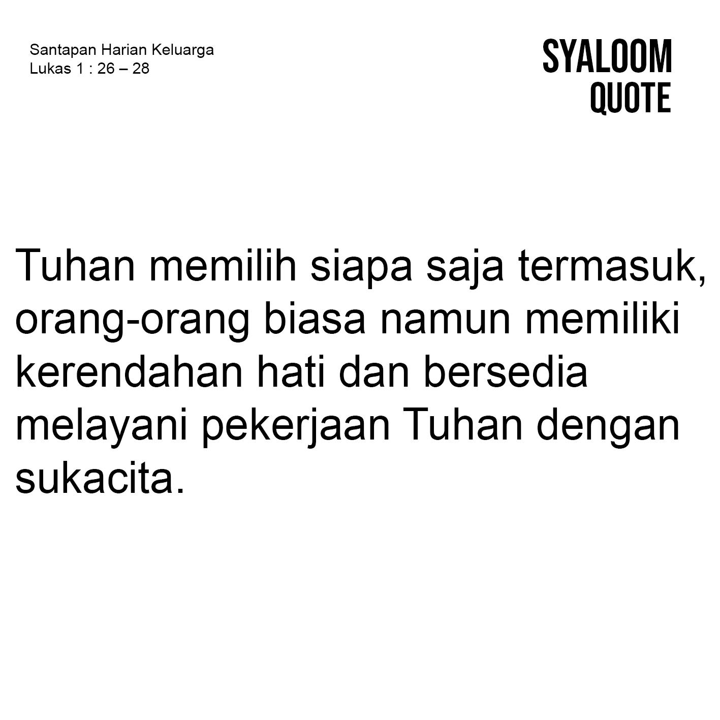 Hari ini umat kristiani di seluruh dunia mempersiapkan diri untuk merayakan Natal Kristus yang tinggal beberapa jam lagi. Untuk itu, marilah kita siapkan hati untuk menyambut Tuhan Yesus, Sang Imanuel melalui pesan Alkitab, Lukas 1: 26-38.