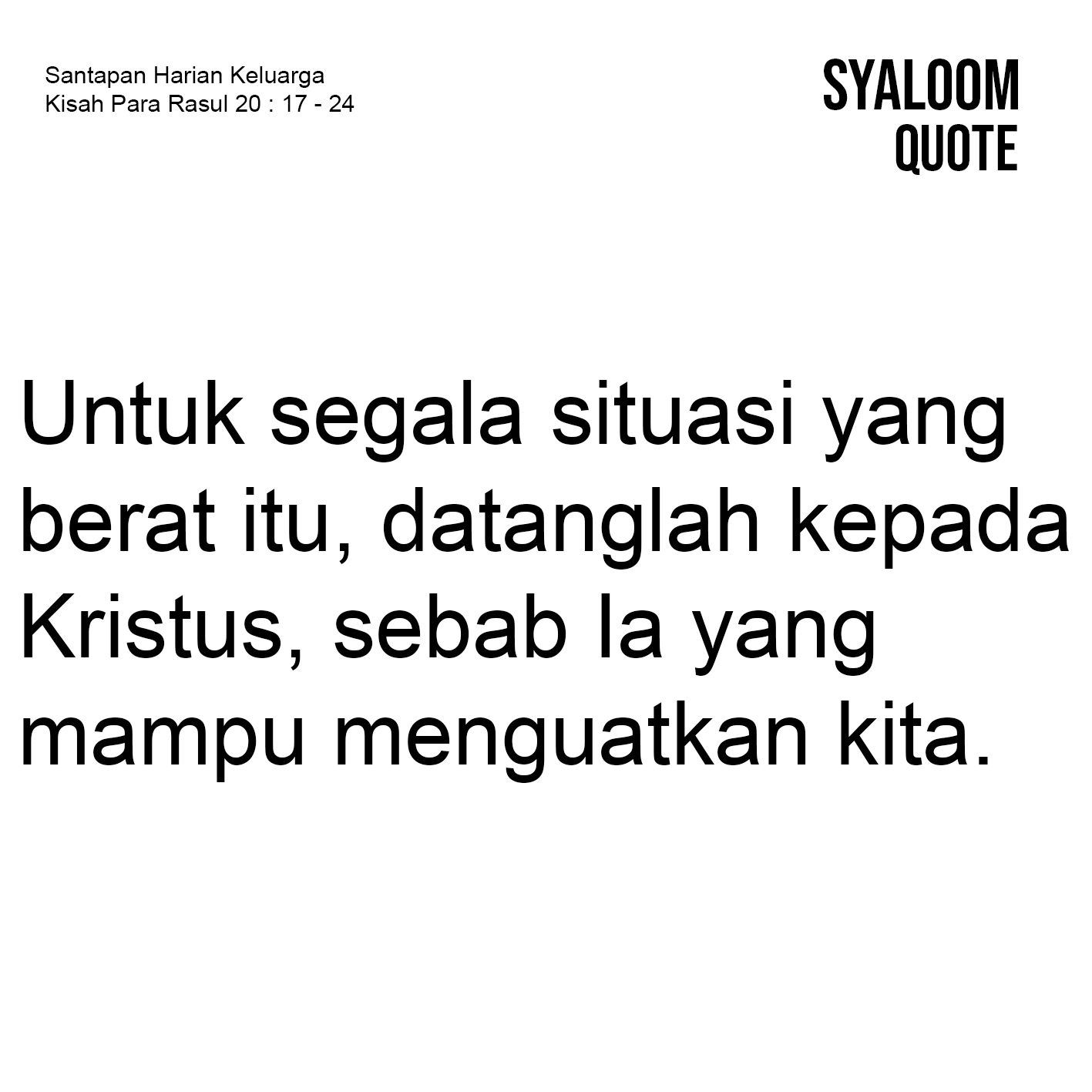 Ada satu pesan dalam pelayanan yang selalu dititipkan, yaitu: “Biarlah kita setia melayani sampai akhir”. Sebenarnya, pesan tersebut bukan tanpa alasan sebab dalam kenyataannya, ada orang yang tidak dapat menunaikan tugasnya dengan setia sampai akhir. Ketika diperhadapkan dengan masalah dalam pelayanan, mereka memilih lari dan meninggalkan pelayanan yang telah dimulainya. Bagi penatua di jemaat Efesus, Paulus kemudian berpesan agar mereka tetap setia sampai akhir (ay. 24). Paulus sadar betul, bahwa pelayanan mereka akan dipenuhi dengan banyak tantangan sampai dapat mencucurkan air mata, bahkan mungkin saja akan ada ancaman hidup (ay. 19). Namun mereka harus percaya, bahwa Kristus yang empunya pekerjaan yang akan mengokohkan dan mendampingi mereka dalam menunaikan pelayanan yang tidak mudah itu. Kita juga mesti belajar dari pesan Paulus, agar tetap setia menjalankan tugas pelayanan dengan setia sampai akhir. Kita sadar, bahwa tugas pelayanan yang kita emban saat ini juga tidak mudah. Kita mungkin akan menangis karena ditolak, kita mungkin akan dimusuhi karena berusaha menyampaikan kebenaran, dan lain sebagainya. Namun untuk segala situasi yang berat itu, datanglah kepada Kristus, sebab Ia yang mampu menguatkan kita.
