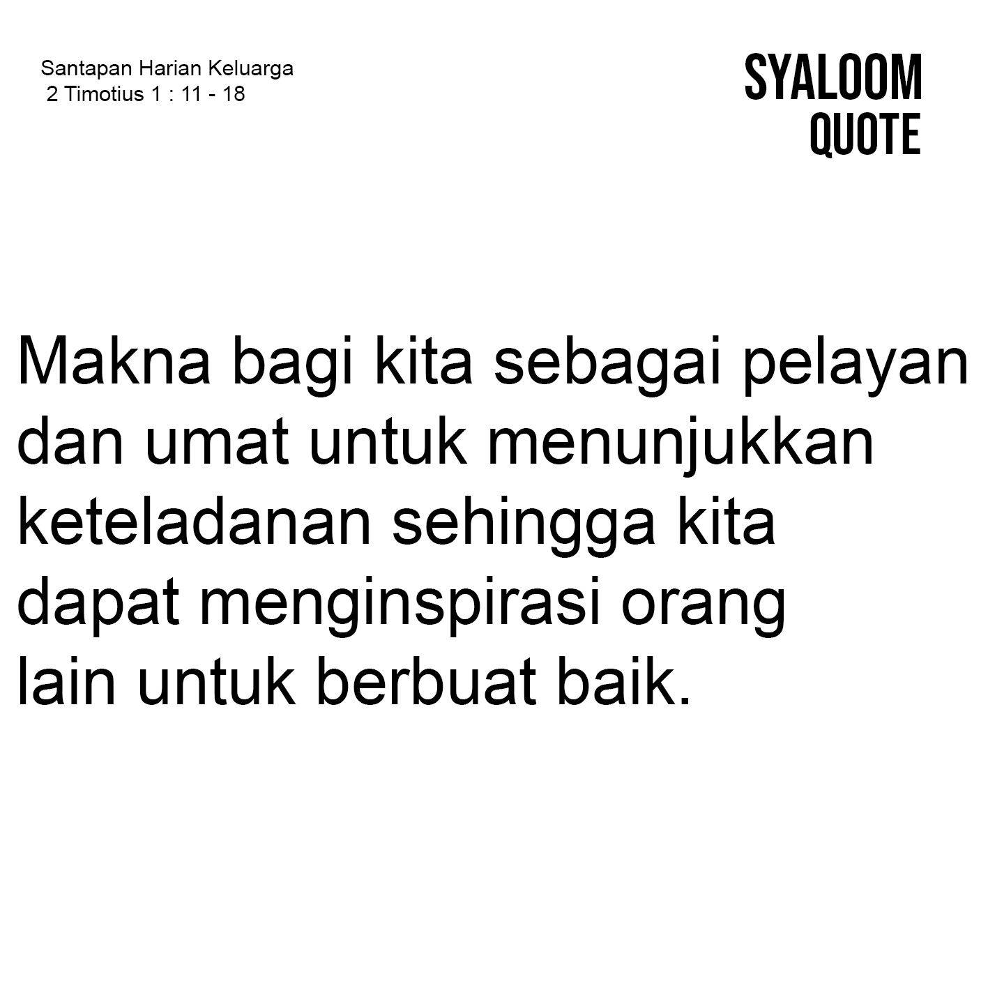 Keteladanan adalah sikap yang menjadi contoh baik dan patut ditiru oleh orang lain. Seseorang yang memiliki keteladanan tidak terbatas pada perkataan tetapi lebih kepada tindakan yang positif, seperti kejujuran, kasih, kerendahan hati dan kepedulian terhadap sesama. Orang yang menunjukkan keteladanan seringkali menginspirasi orang lain untuk berbuat baik. Hal ini ditunjukkan oleh Rasul Paulus dalam menginspirasi Timotius untuk tetap setia kepada panggilan Allah, serta juga menunjukkan keteguhan dalam kasih dan pengharapan di tengah kesulitan, berpegang pada ajaran Tuhan (ayat 13). Makna bagi kita sebagai pelayan dan umat untuk menunjukkan keteladanan sehingga kita dapat menginspirasi orang lain untuk berbuat baik. Panutan dalam kehidupan sehari-hari dengan memiliki peran yang sangat penting dalam mendidik dan membentuk karakter seseorang baik dalam keluarga, gereja dan masyarakat untuk tetap setia kepada panggilan Allah.