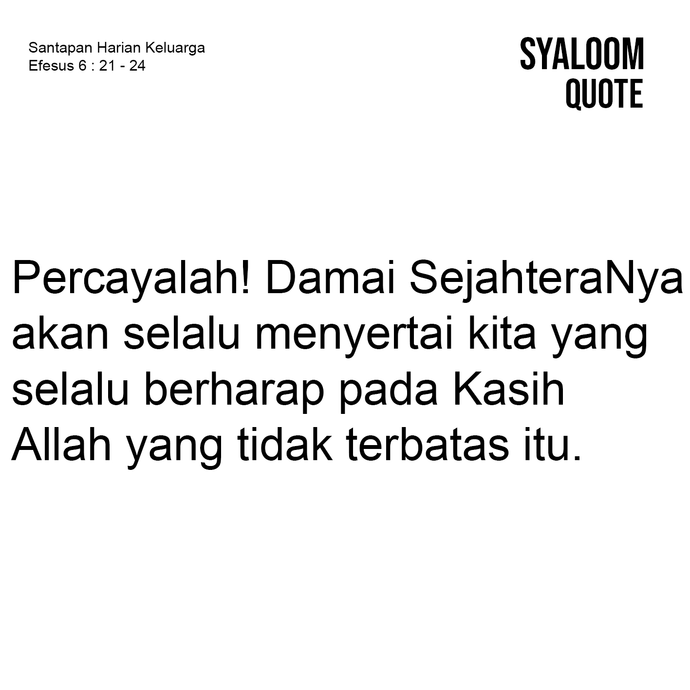 Pasal 6 : 21-24 adalah bagian akhir dari surat Rasul Paulus kepada jemaat di Efesus. Bagian akhir ini merupakan kelanjutan dari ayat sebelumnya dimana Paulus memperingatkan jemaat di Efesus agar jemaat tetap teguh dan berpengharapan hanya pada Tuhan. Kondisi yang dialami Paulus membuat ia menjadi kuat dan karena itu, ia menyerukan dan mengingatkan jemaat Efesus untuk tetap berakar dan teguh pada Kristus. Kesetiaan dan keteguhan hati seorang pengikut Kristus mengantarnya pada keadaan dimana Damai Sejahtera akan senantiasa menaunginya.