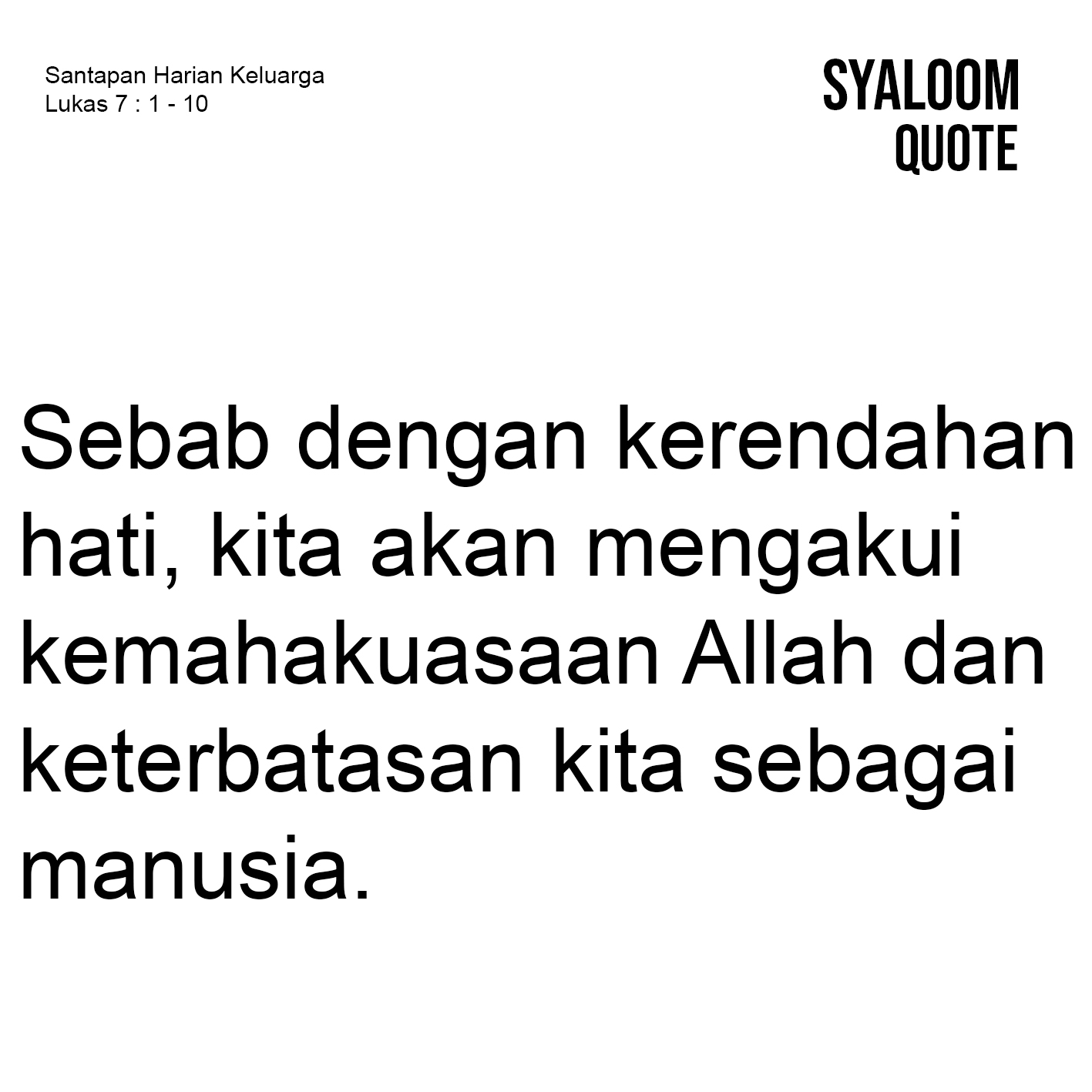 Memiliki jabatan dan kekuasaan sering kali menjadikan kita tinggi hati dan memandang rendah orang lain. Kendatipun realitas ini dapat kita temui dimana-mana, namun hal yang berbeda justru nampak dalam pribadi seorang perwira di Kapernaum dalam bacaan kita. Kerendahan hatinya itu nampak dari cara ia bersikap serta memperlakukan hambanya (ay. 2-3). Hal yang sama pun terlihat ketika sang perwira menganggap dirinya tidak layak menemui dan menerima Yesus di dalam rumahnya, untuk menyembuhkan hambanya (ay. 6-7). Terkait dengan itu sang perwira hanya meminta Yesus untuk mengatakan sepatah kata dan dalam keyakinannya ia meyakini hambanya akan sembuh. Keyakinannya terhadap kuasa Yesus lahir dan bertumbuh hanya dengan mendengar mujizat-mujizat yang dilakukan-Nya. Pengalaman iman seperti ini memberikan pelajaran yang berharga bagi kita sebagai orang percaya, agar semakin bertumbuh dalam iman percaya kepada Yesus. Salah satu wujud bertumbuhnya iman kita kepada-Nya yaitu hidup dalam kerendahan hati. Karena itu sekalipun kita dianugerahi jabatan dan kekuasaan serta kekayaan yang berlimpah, tetaplah rendah hati di hadapan-Nya. Sebab dengan kerendahan hati, kita akan mengakui kemahakuasaan Allah dan keterbatasan kita sebagai manusia. Tetaplah rendah hati dan pastikanlah iman kita terus bertumbuh dari waktu ke waktu.
