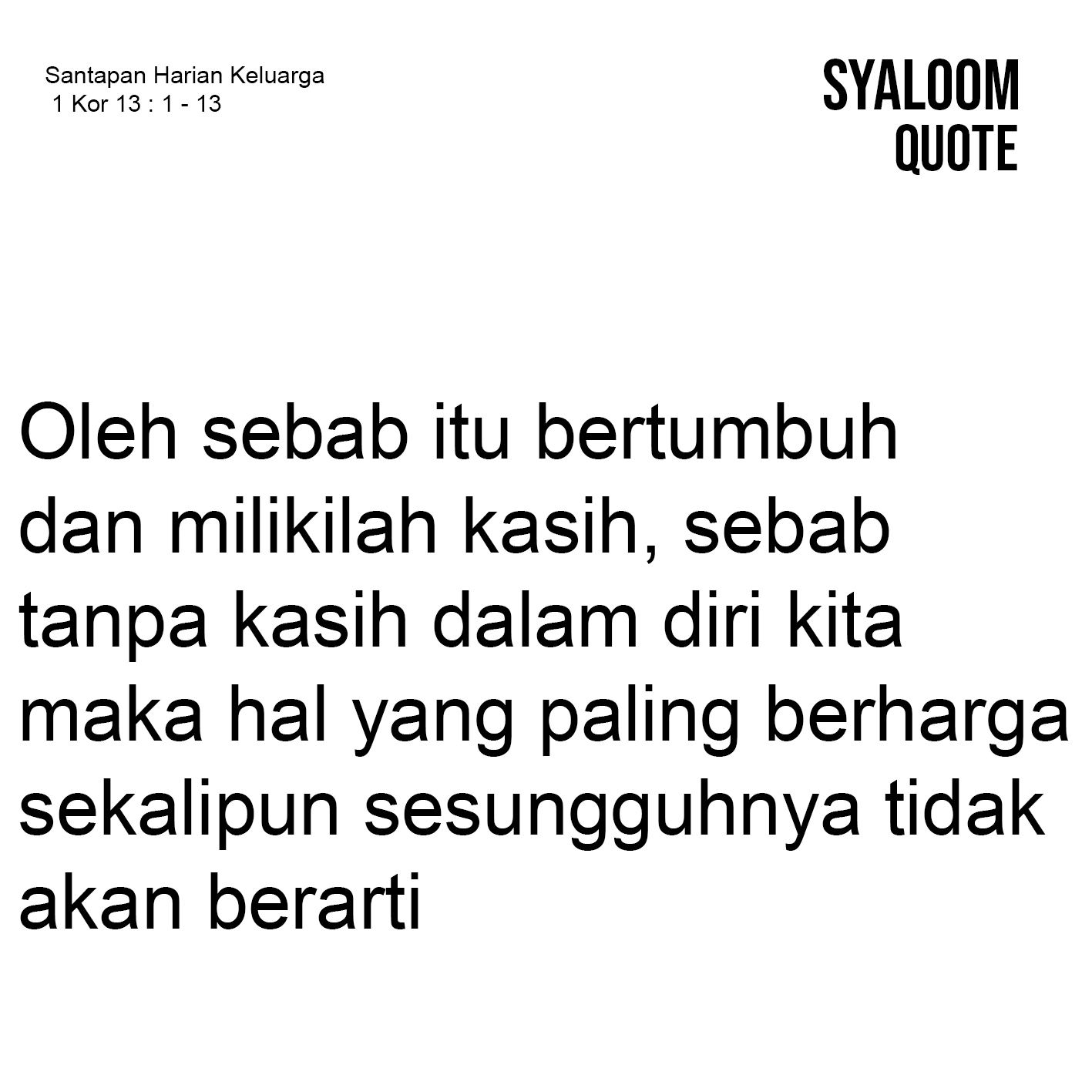 Ada banyak hal yang terlintas dalam pikiran kita jika diperhadapkan dengan pertanyaan, apa yang paling penting dalam hidupmu? Atas pertanyaan itu kita dapat memberi jawaban misalnya: keluarga, karir, pelayanan, dll. Namun pada bagian bacaan kita, rasul Paulus hendak menegaskan bahwa tidak ada hal yang paling penting dalam hidup ini selain memiliki kasih (ay. 1-3). Kasih yang dimaksudkannya yaitu kasih agape yang menunjuk pada kasih Allah. Kasih itu sabar, baik hati, tidak cemburu, tidak memegahkan diri, tidak sombong, tidak melakukan yang tidak sopan, tidak mencari keuntungan diri sendiri, tidak pemarah, tidak menyimpan kesalahan orang lain, tidak bersukacita karena ketidakadilan, menahan segala sesuatu, percaya segala sesuatu, mengharapkan segala sesuatu, sabar menanggung segala sesuatu dan tidak berkesudahan (ay. 4-8), harus dimiliki sebagai orang percaya. Namun, apa yang menjadi alasan kita harus memiliki kasih? Sebab Allah yang kita sembah sudah lebih dahulu menyatakan kasih-Nya bagi kita. Kasih kepada Allah harus diwujudnyatakan dalam kehidupan antara sesama manusia maupun ciptaan-Nya yang lain. Biarlah kasih tidak hanya dipahami sebatas pengetahuan saja, melainkan dimiliki dan diterapkan dalam kehidupan keluarga, bergereja maupun bermasyarakat. Memang hal ini tidaklah mudah, akan tetapi mengupayakannya adalah tanggungjawab bersama sebagai orang-orang yang percaya kepada Allah. Oleh sebab itu bertumbuh dan milikilah kasih, sebab tanpa kasih dalam diri kita maka hal yang paling berharga sekalipun sesungguhnya tidak akan berarti