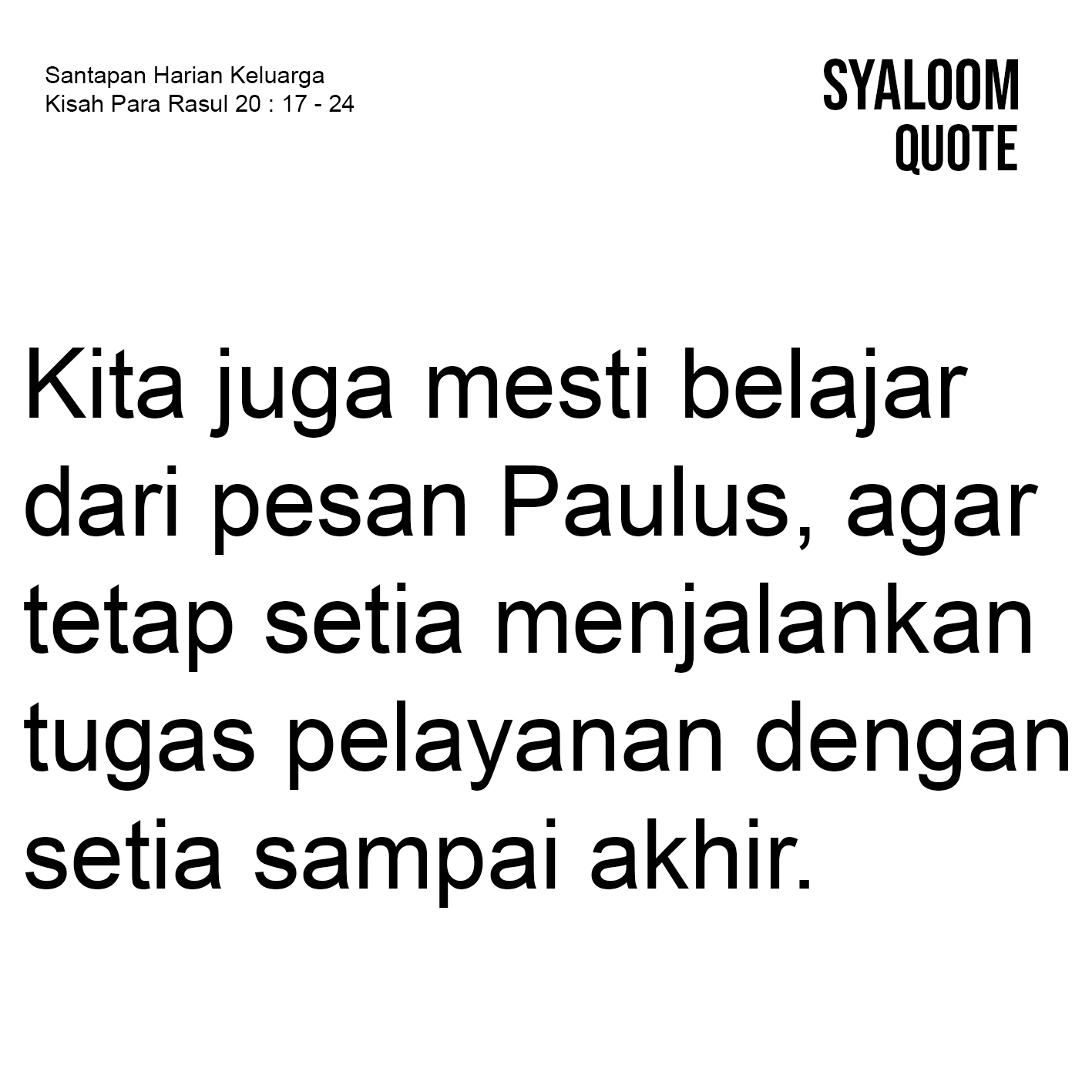 Ada satu pesan dalam pelayanan yang selalu dititipkan, yaitu: “Biarlah kita setia melayani sampai akhir”. Sebenarnya, pesan tersebut bukan tanpa alasan sebab dalam kenyataannya, ada orang yang tidak dapat menunaikan tugasnya dengan setia sampai akhir. Ketika diperhadapkan dengan masalah dalam pelayanan, mereka memilih lari dan meninggalkan pelayanan yang telah dimulainya. Bagi penatua di jemaat Efesus, Paulus kemudian berpesan agar mereka tetap setia sampai akhir (ay. 24). Paulus sadar betul, bahwa pelayanan mereka akan dipenuhi dengan banyak tantangan sampai dapat mencucurkan air mata, bahkan mungkin saja akan ada ancaman hidup (ay. 19). Namun mereka harus percaya, bahwa Kristus yang empunya pekerjaan yang akan mengokohkan dan mendampingi mereka dalam menunaikan pelayanan yang tidak mudah itu. Kita juga mesti belajar dari pesan Paulus, agar tetap setia menjalankan tugas pelayanan dengan setia sampai akhir. Kita sadar, bahwa tugas pelayanan yang kita emban saat ini juga tidak mudah. Kita mungkin akan menangis karena ditolak, kita mungkin akan dimusuhi karena berusaha menyampaikan kebenaran, dan lain sebagainya. Namun untuk segala situasi yang berat itu, datanglah kepada Kristus, sebab Ia yang mampu menguatkan kita.